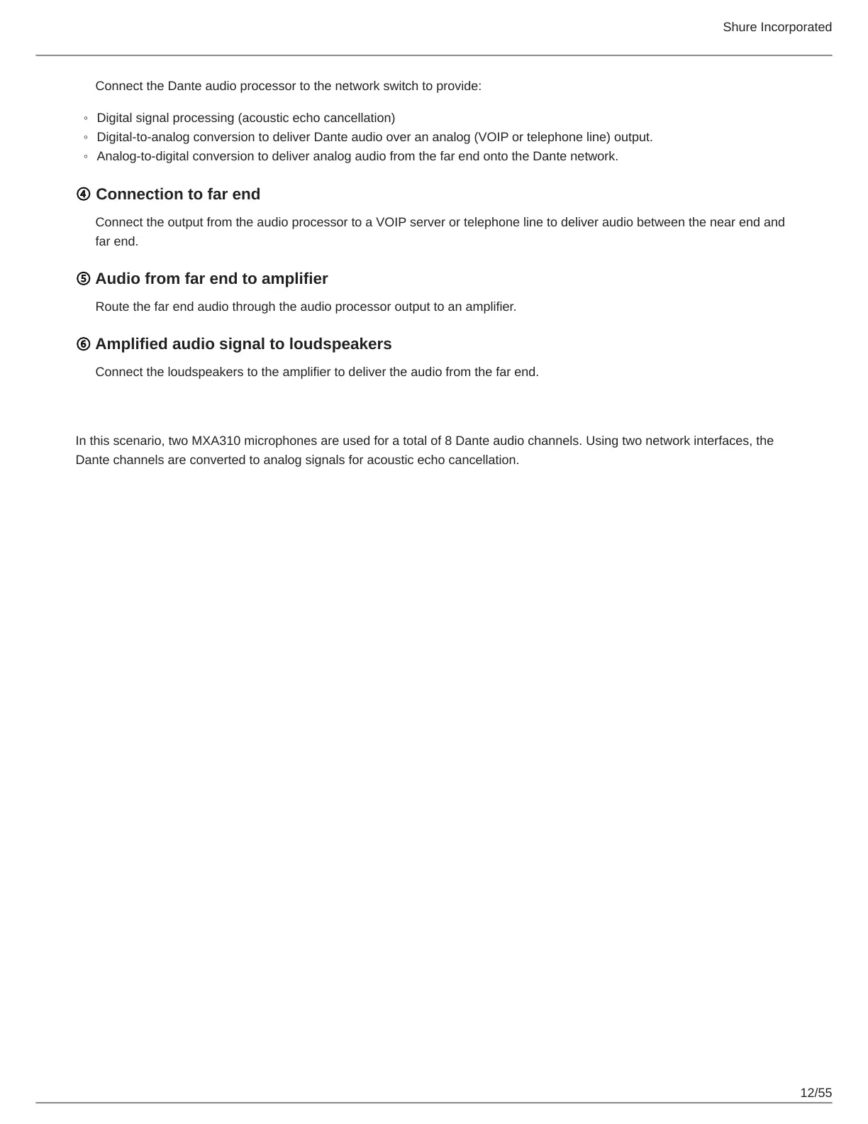 In this scenario, two MXA310 microphones are used for a total of 8 Dante audio channels. Using two network interfaces, the