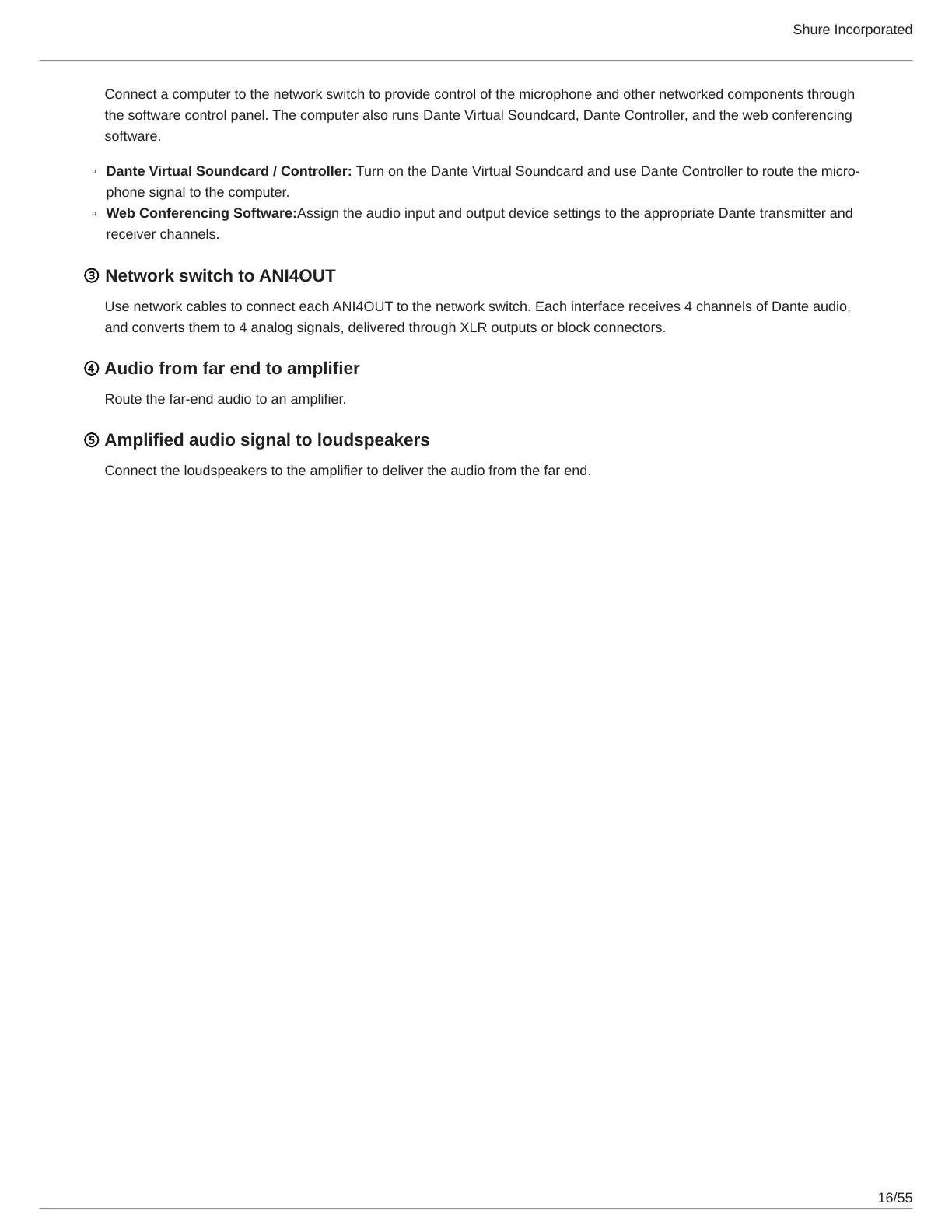 Use network cables to connect each ANI4OUT to the network switch. Each interface receives 4 channels of Dante audio,