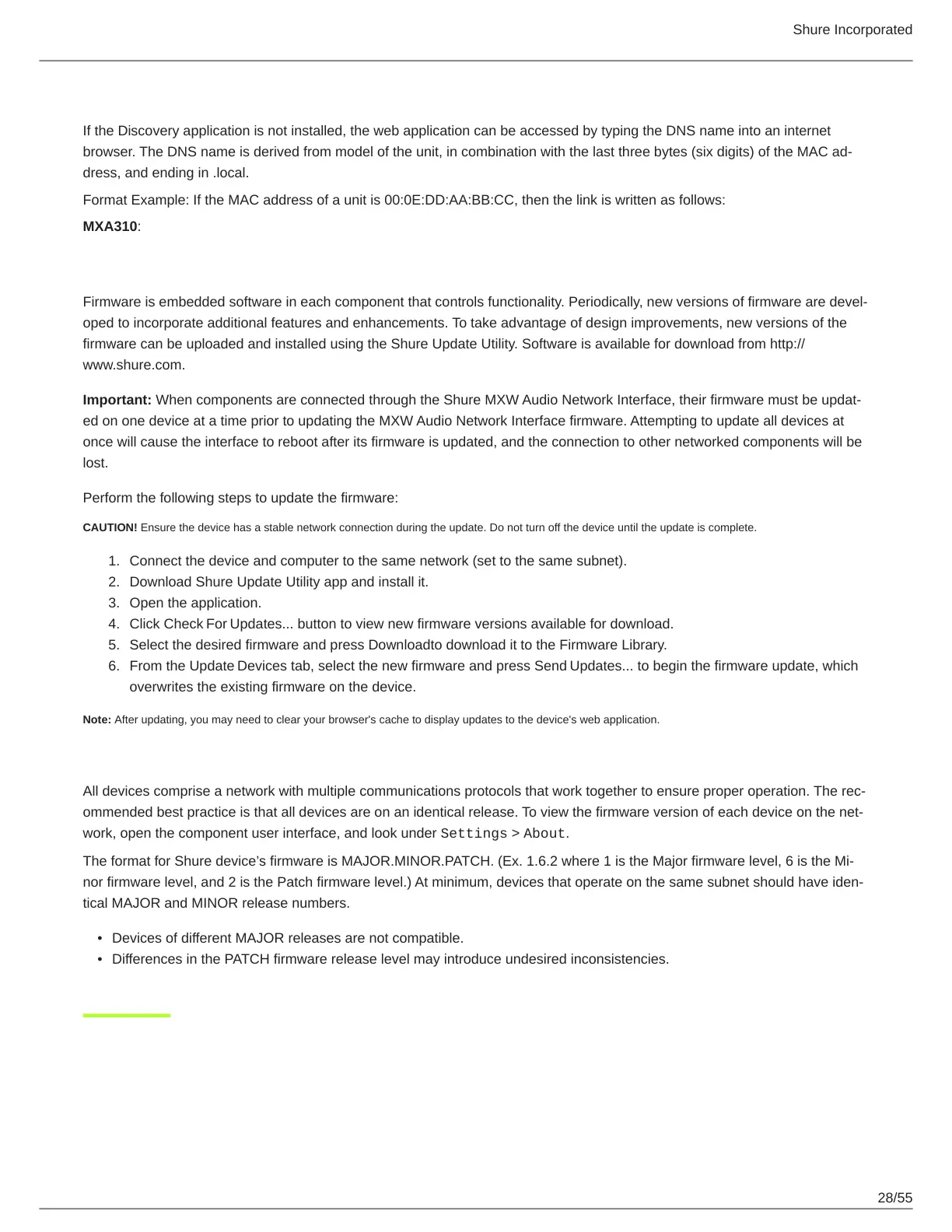 The format for Shure device’s firmware is MAJOR.MINOR.PATCH. (Ex. 1.6.2 where 1 is the Major firmware level, 6 is the Mi-