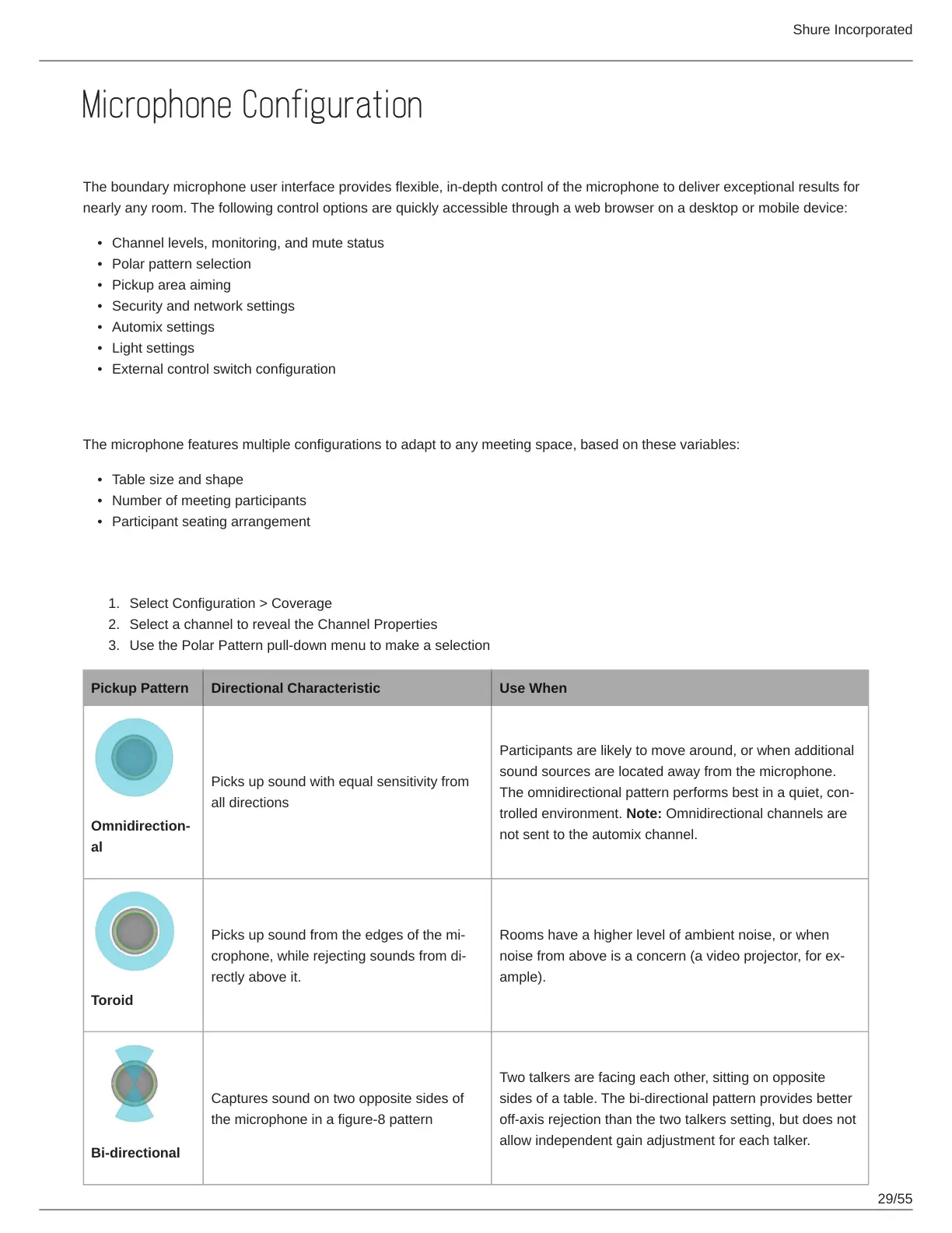 The microphone features multiple configurations to adapt to any meeting space, based on these variables: