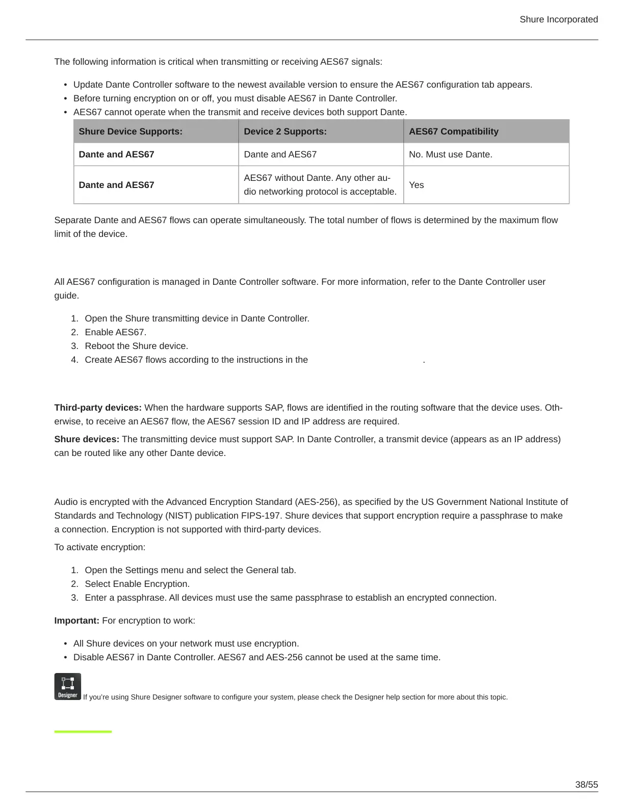 Standards and Technology (NIST) publication FIPS-197. Shure devices that support encryption require a passphrase to make