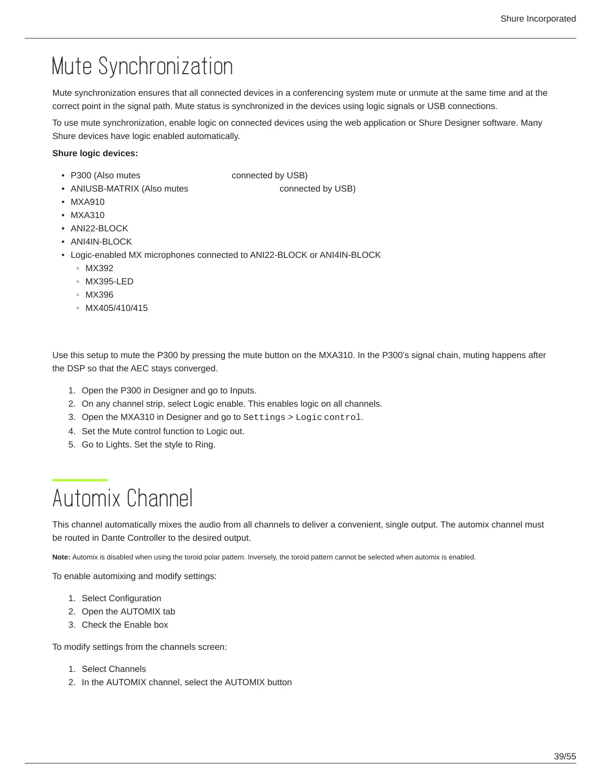 To use mute synchronization, enable logic on connected devices using the web application or Shure Designer software. Many