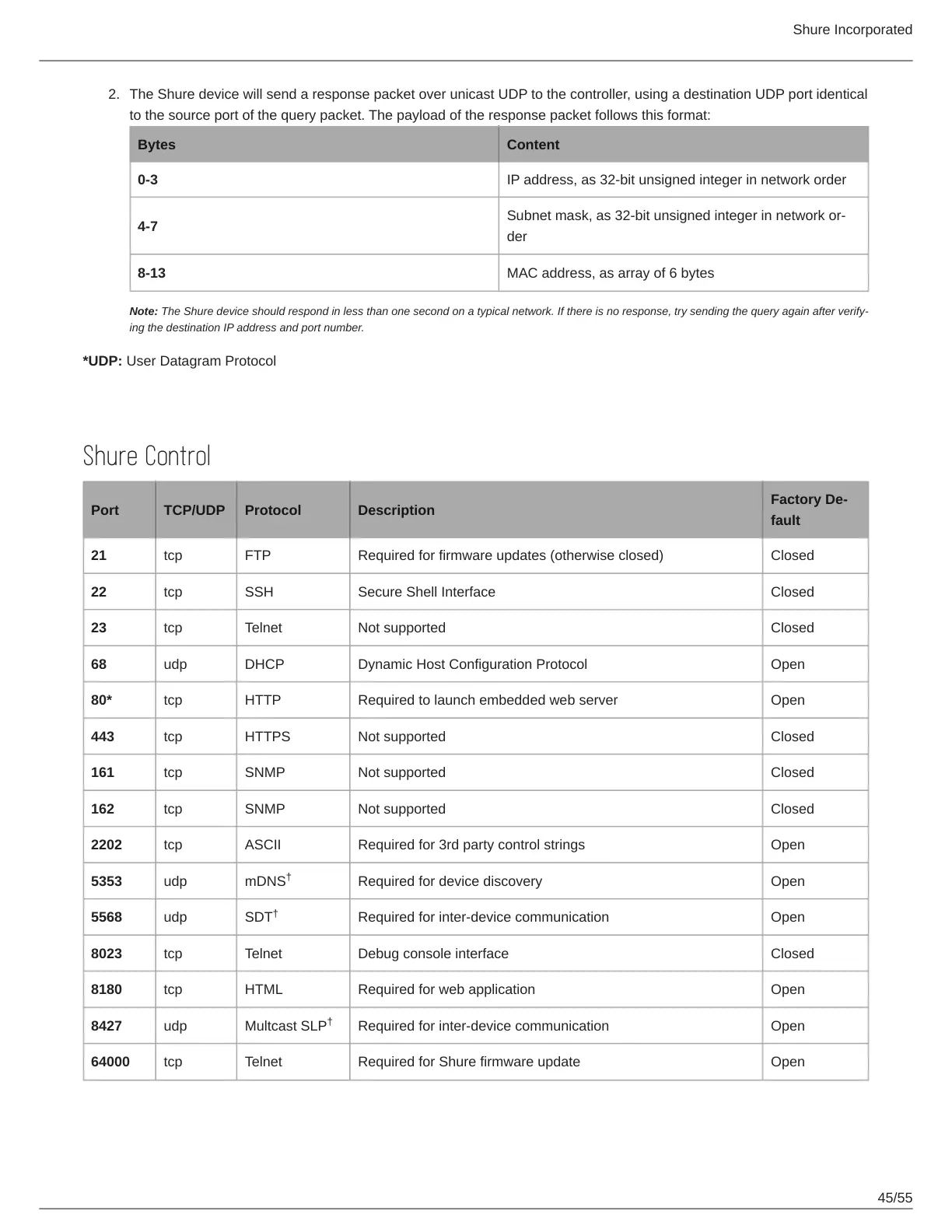 2. The Shure device will send a response packet over unicast UDP to the controller, using a destination UDP port identical