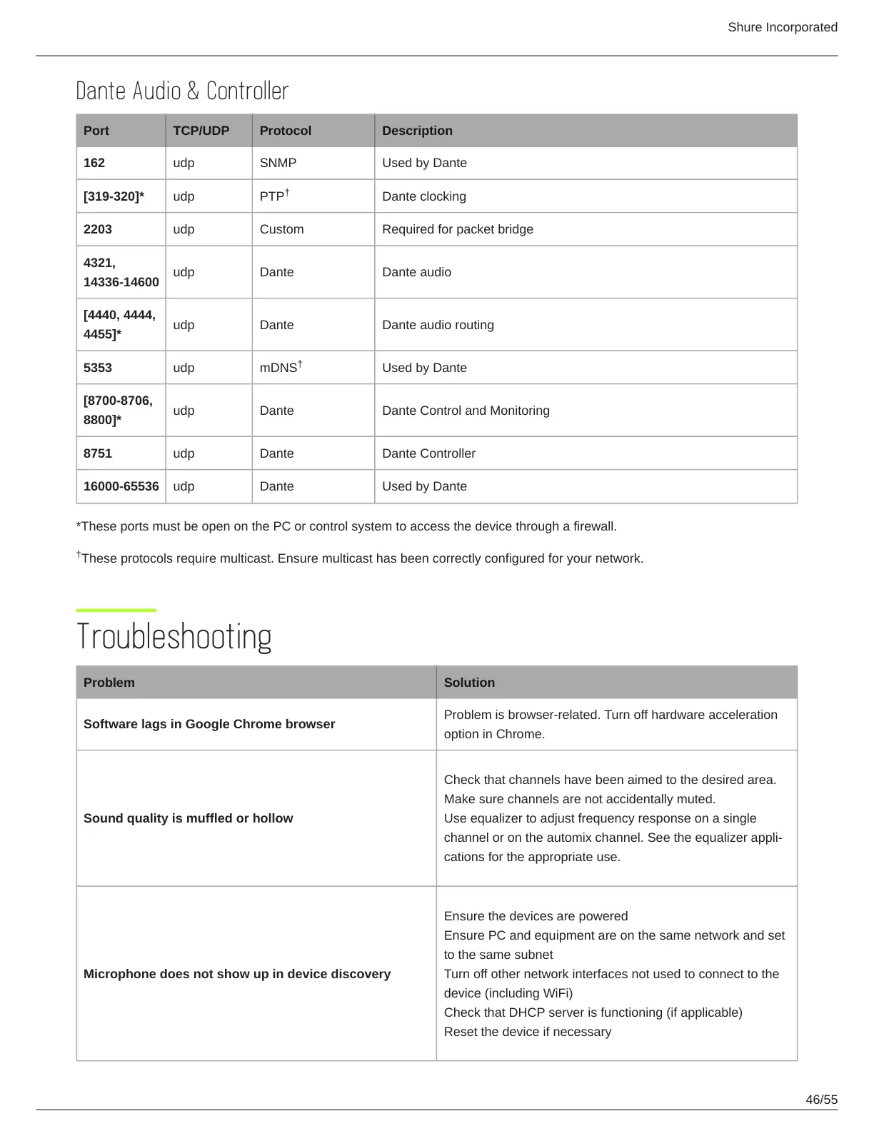*These ports must be open on the PC or control system to access the device through a firewall.