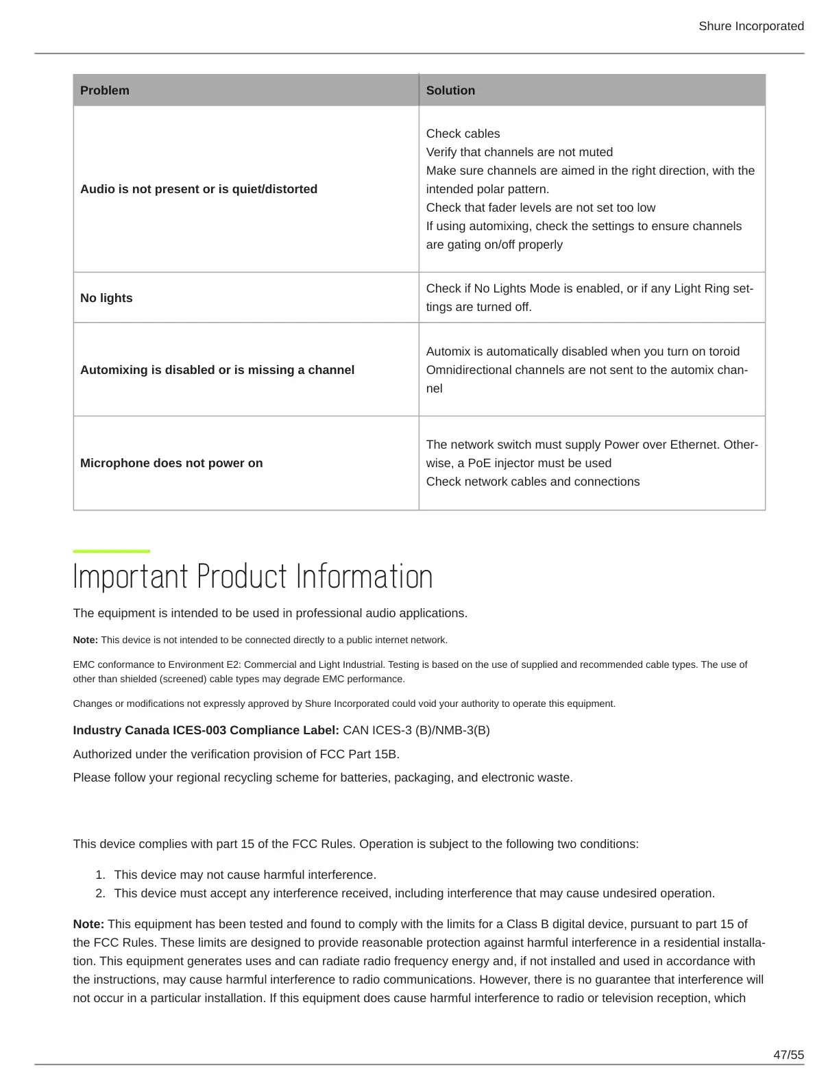 Changes or modifications not expressly approved by Shure Incorporated could void your authority to operate this equipment.