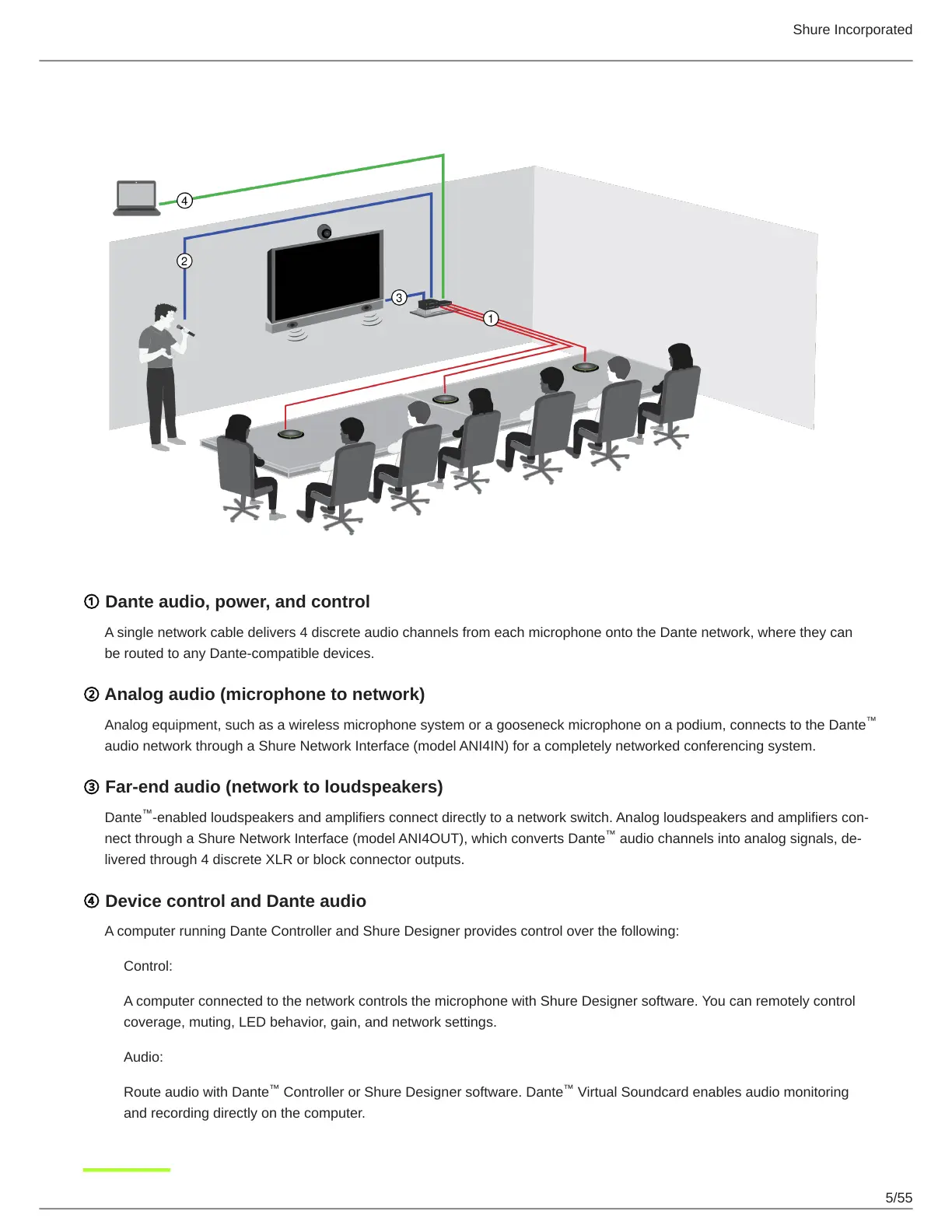 audio network through a Shure Network Interface (model ANI4IN) for a completely networked conferencing system.