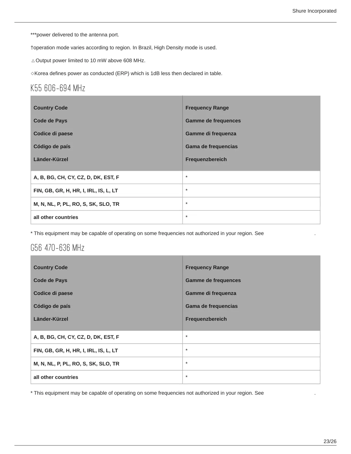 ◇Korea defines power as conducted (ERP) which is 1dB less then declared in table.