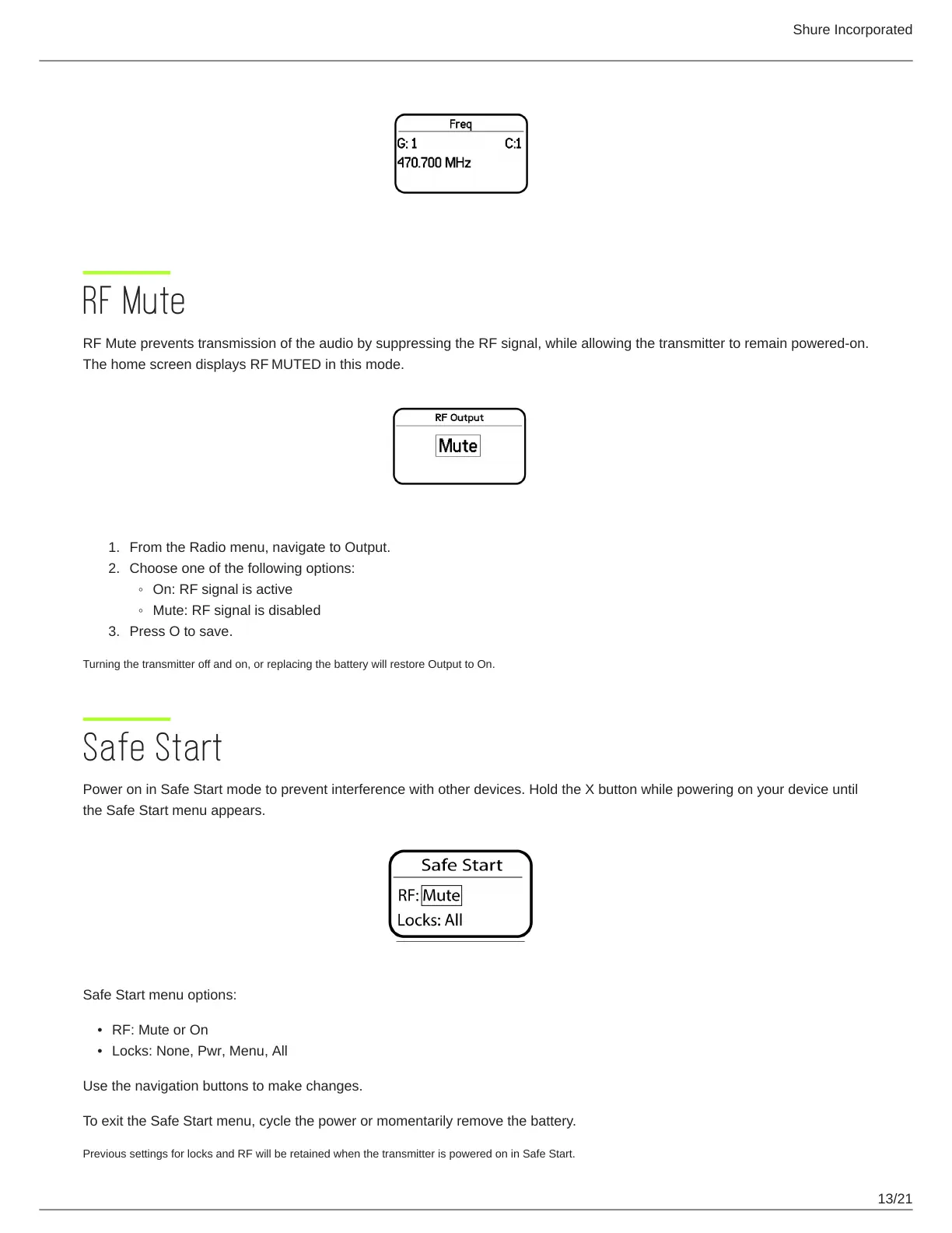 Previous settings for locks and RF will be retained when the transmitter is powered on in Safe Start.