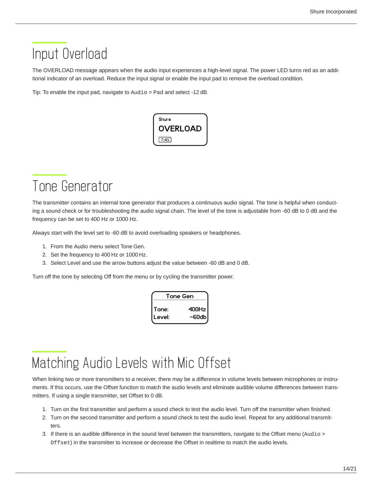 If there is an audible difference in the sound level between the transmitters, navigate to the Offset menu (Audio >