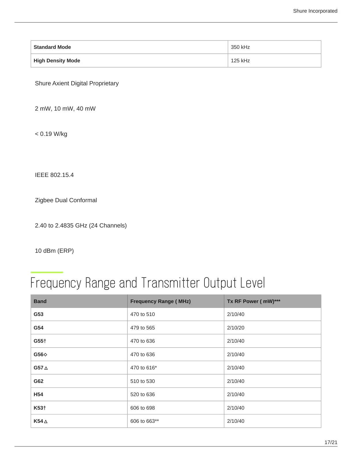 Band Frequency Range ( MHz) Tx RF Power ( mW)***