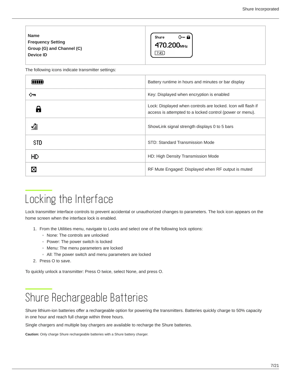 Caution: Only charge Shure rechargeable batteries with a Shure battery charger.