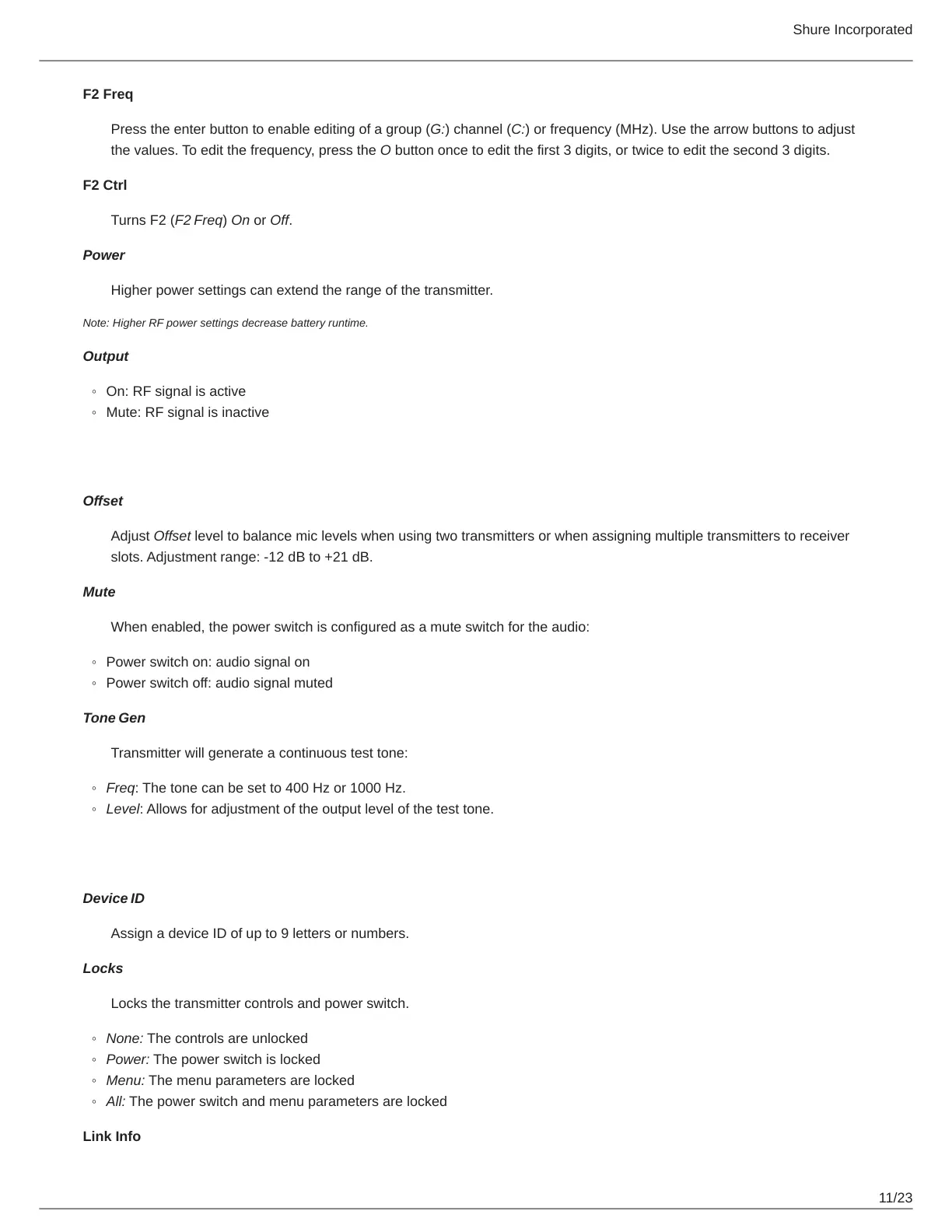 Adjust Offset level to balance mic levels when using two transmitters or when assigning multiple transmitters to receiver