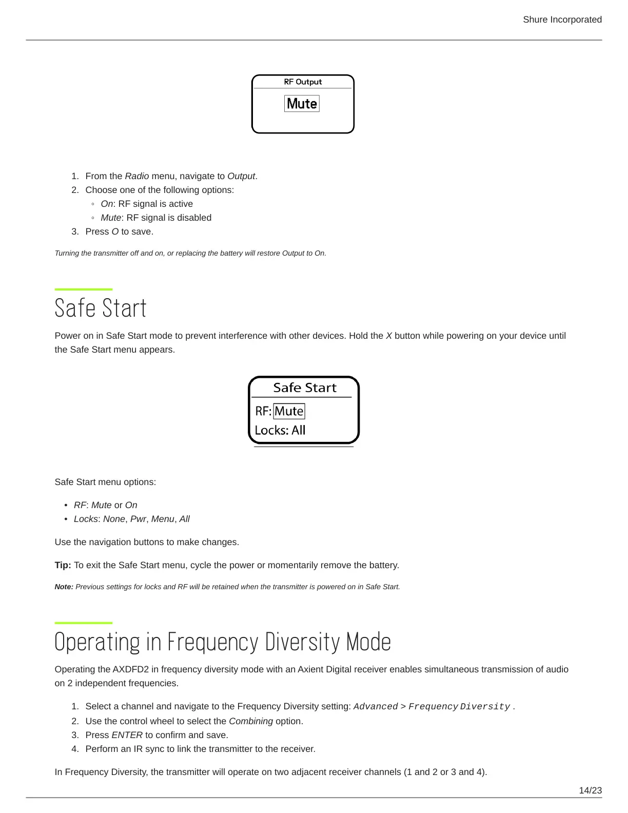 Note: Previous settings for locks and RF will be retained when the transmitter is powered on in Safe Start.
