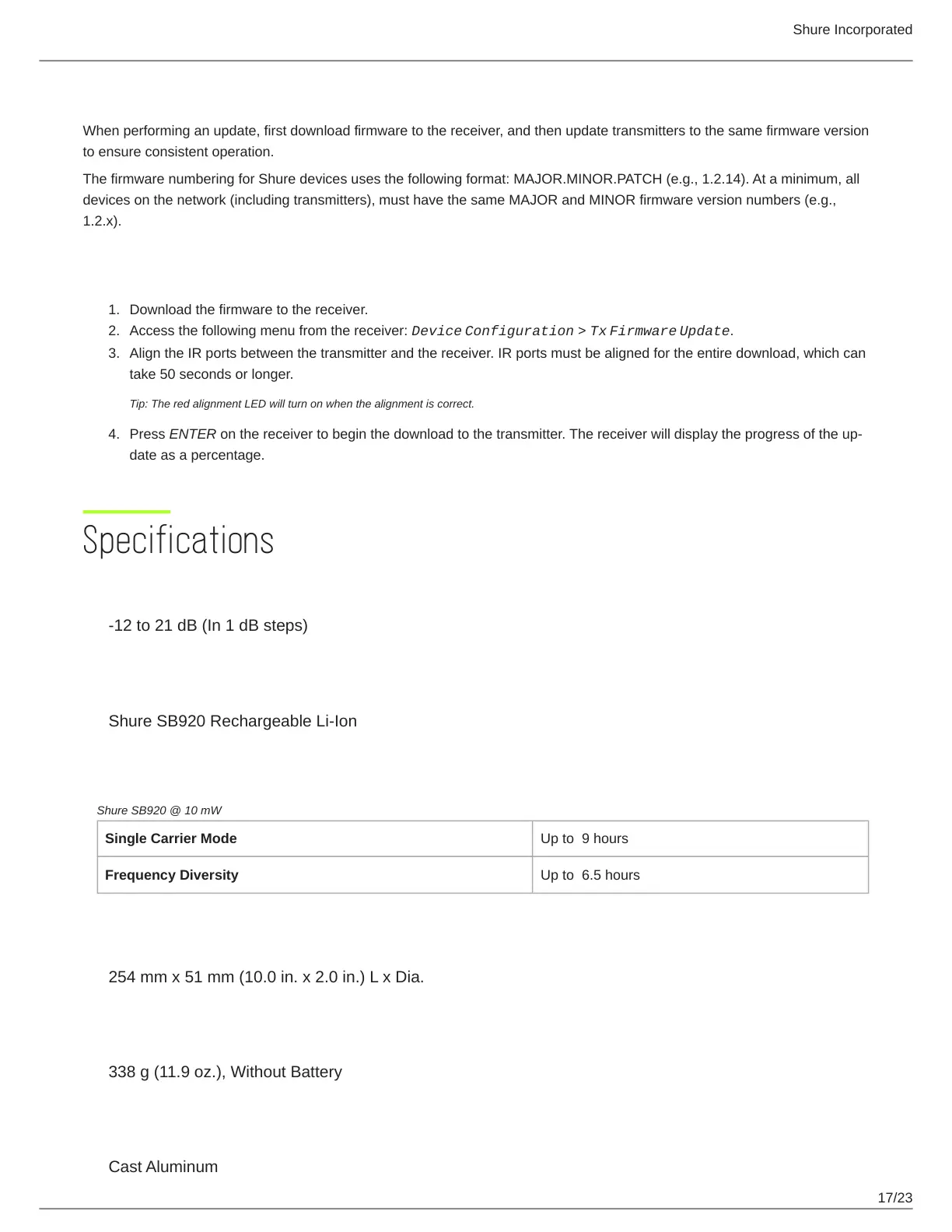 The firmware numbering for Shure devices uses the following format: MAJOR.MINOR.PATCH (e.g., 1.2.14). At a minimum, all