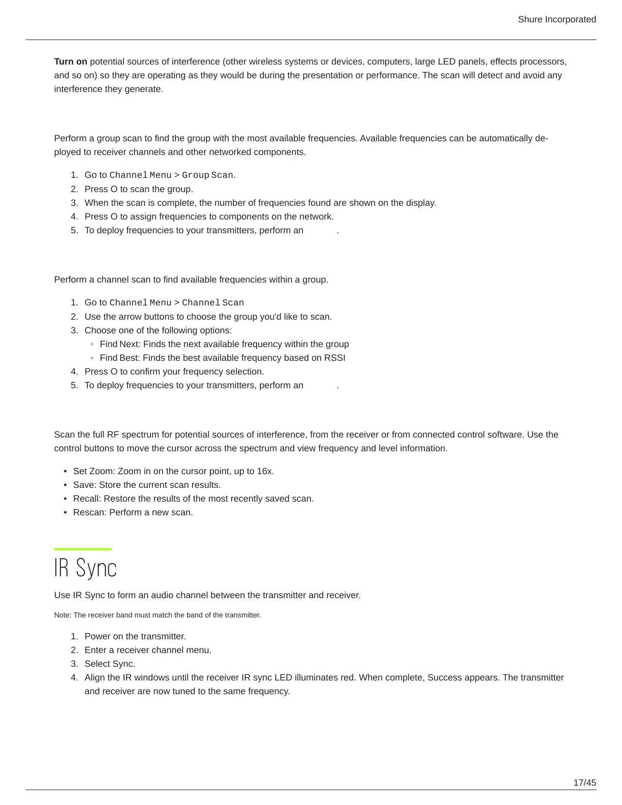 To deploy frequencies to your transmitters, perform an IR sync.