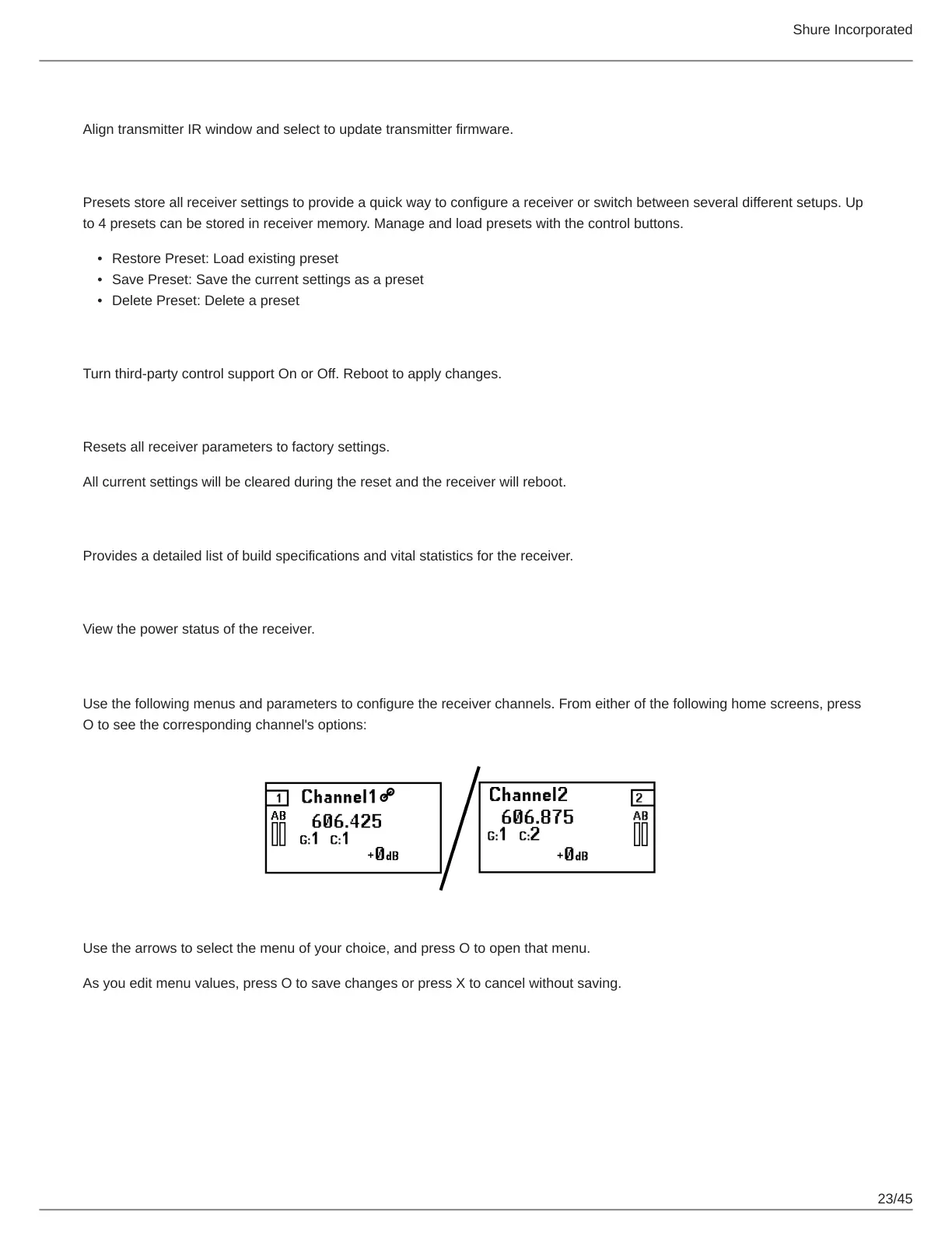 Use the following menus and parameters to configure the receiver channels. From either of the following home screens, press