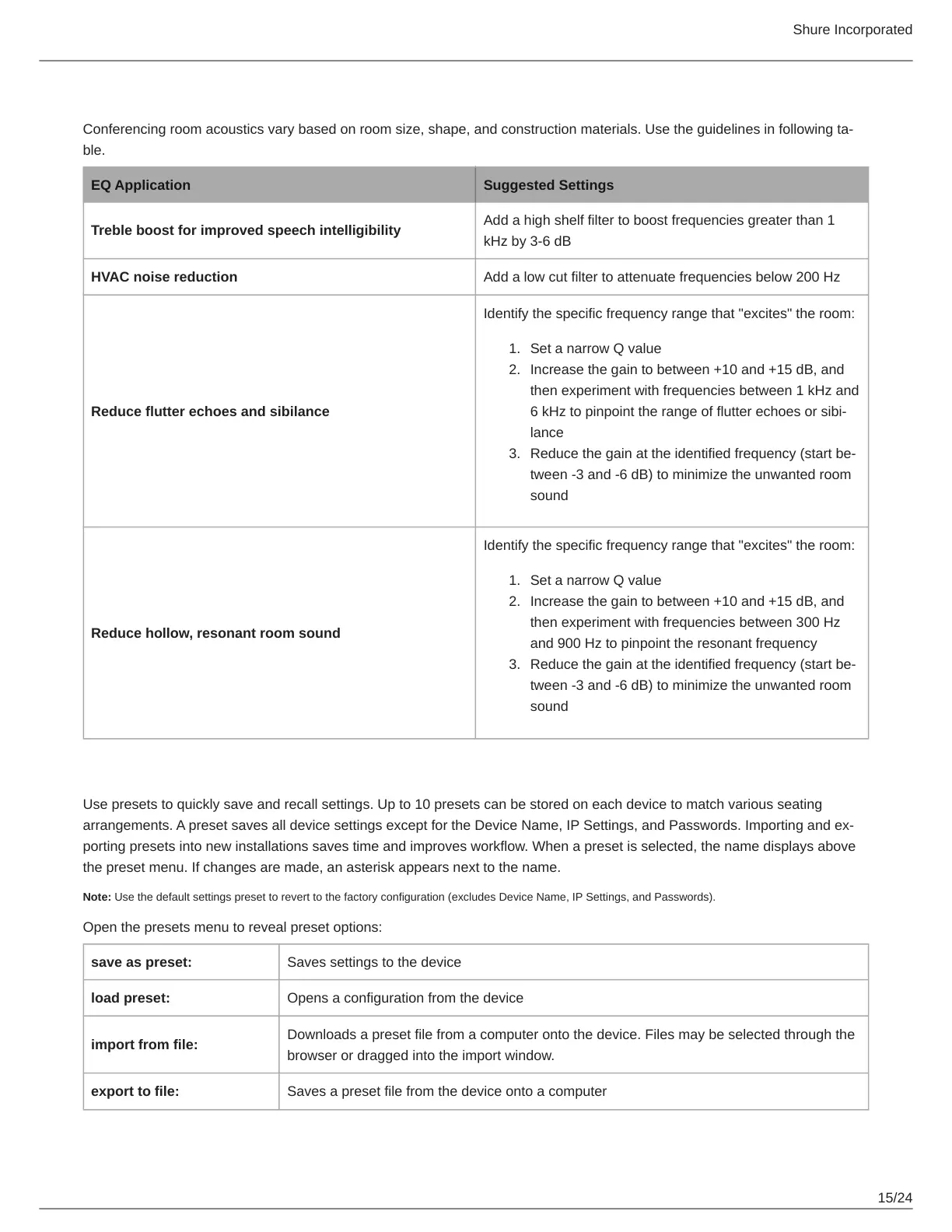 Conferencing room acoustics vary based on room size, shape, and construction materials. Use the guidelines in following ta