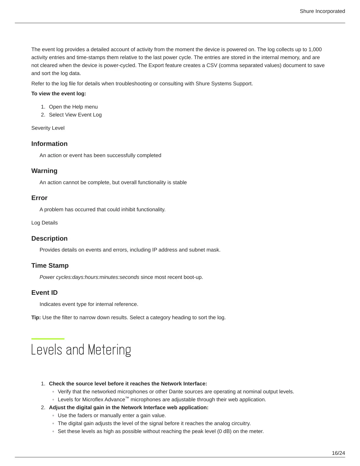 Refer to the log file for details when troubleshooting or consulting with Shure Systems Support.