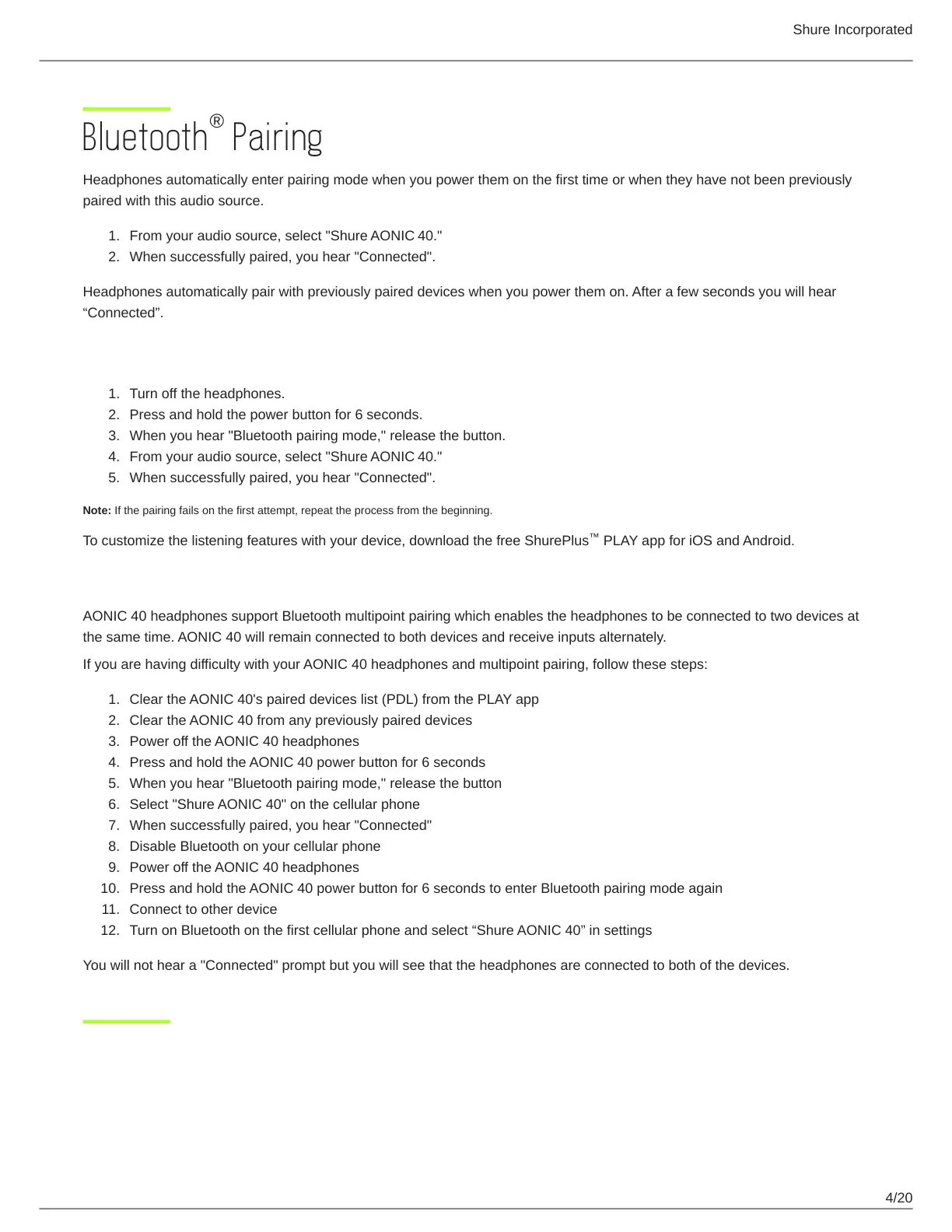 To customize the listening features with your device, download the free ShurePlus PLAY app for iOS and Android.