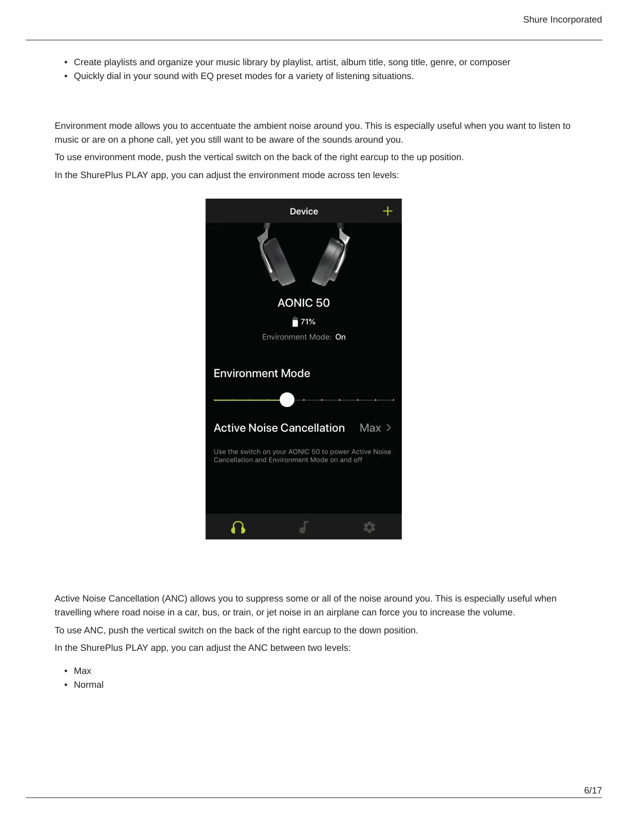 In the ShurePlus PLAY app, you can adjust the ANC between two levels: