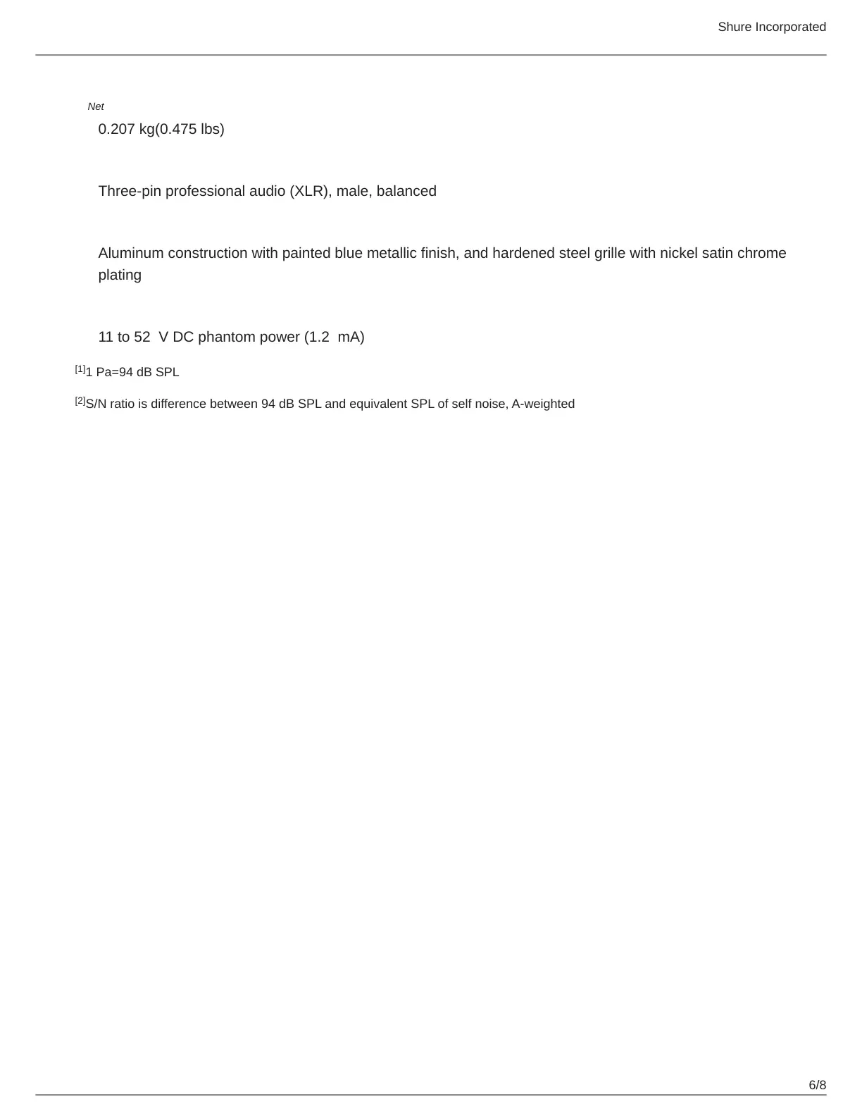 11 to 52 V DC phantom power (1.2 mA)