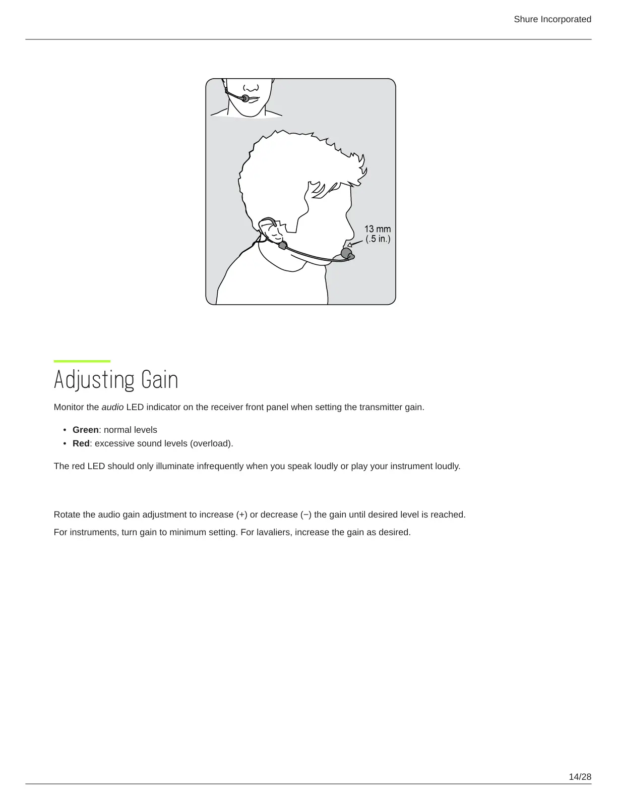 For instruments, turn gain to minimum setting. For lavaliers, increase the gain as desired.