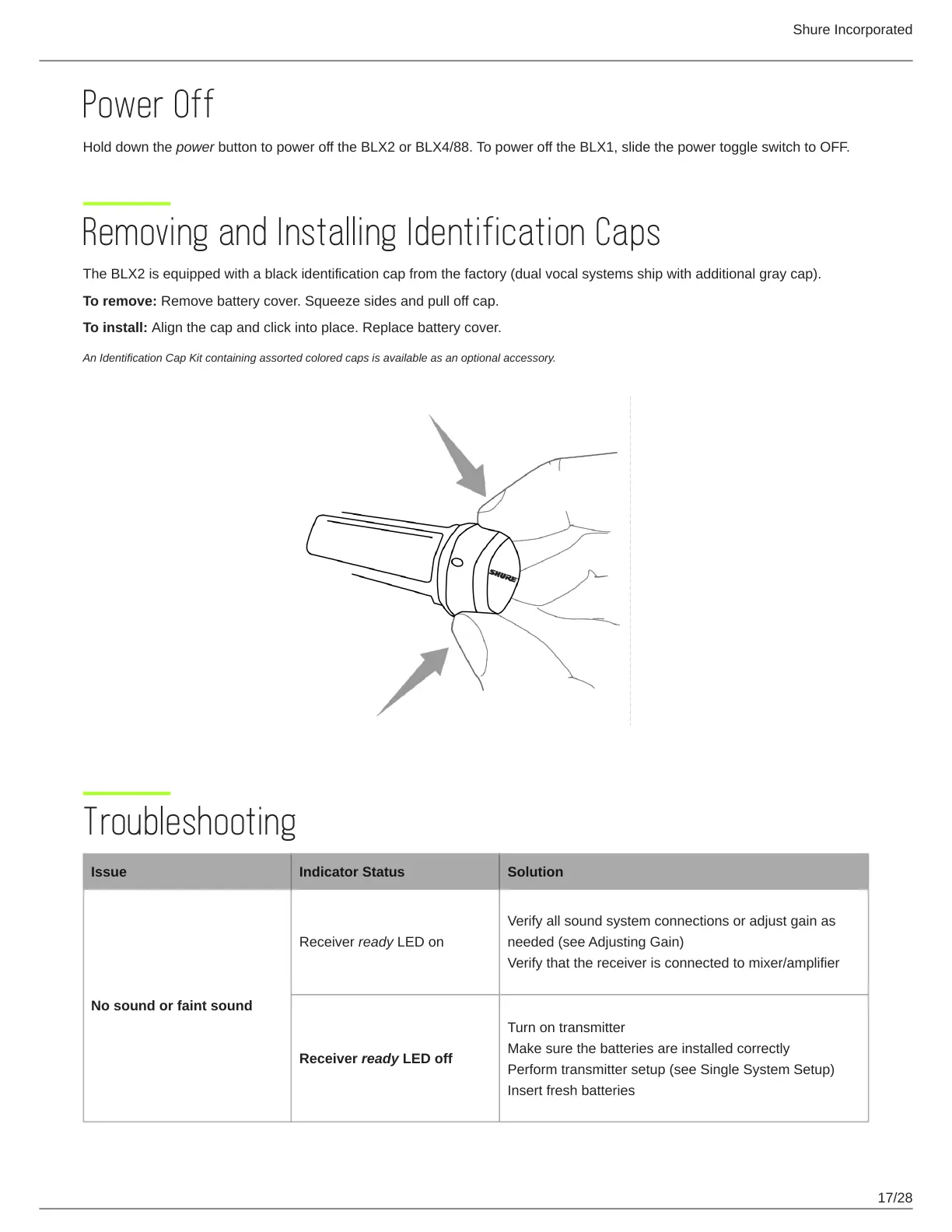 The BLX2 is equipped with a black identification cap from the factory (dual vocal systems ship with additional gray cap).