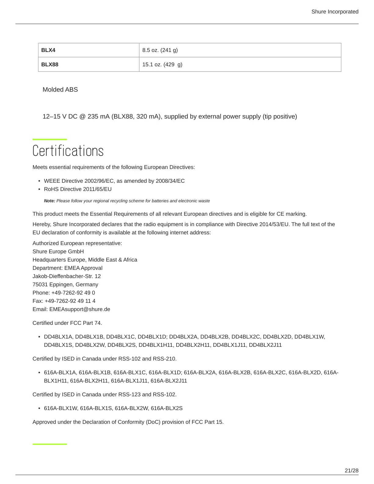 EU declaration of conformity is available at the following internet address: http://www.shure.com/europe/compliance