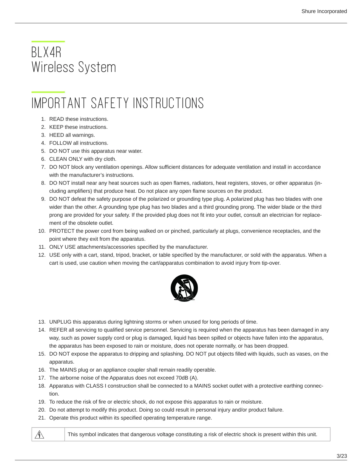 This symbol indicates that dangerous voltage constituting a risk of electric shock is present within this unit.