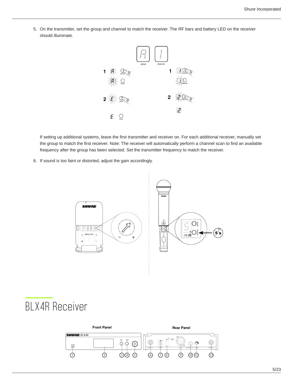 On the transmitter, set the group and channel to match the receiver. The RF bars and battery LED on the receiver