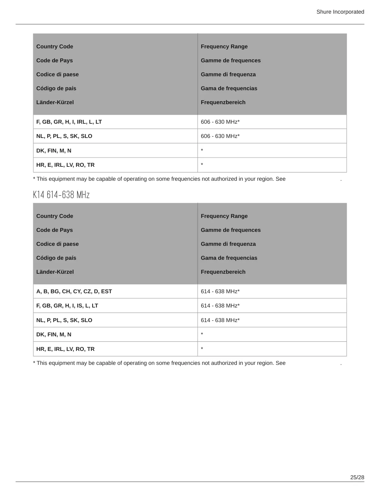 NL, P, PL, S, SK, SLO 606 - 630 MHz*
