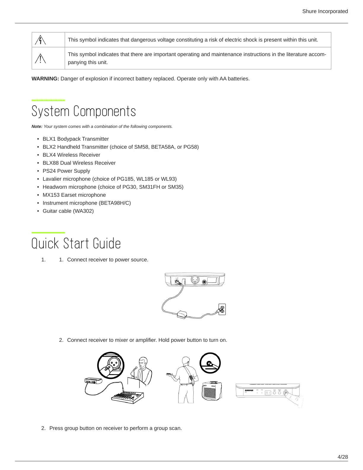 Connect receiver to mixer or amplifier. Hold power button to turn on.