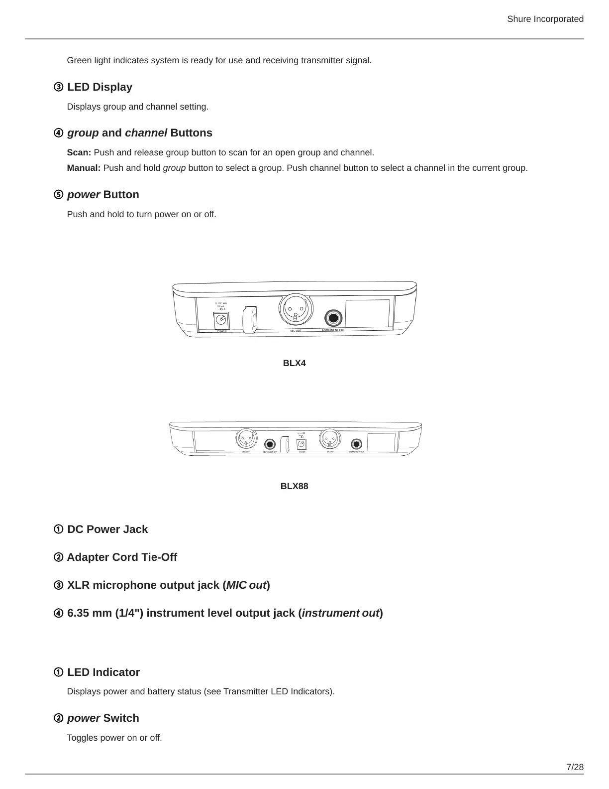 ④ 6.35 mm (1/4") instrument level output jack (instrument out)