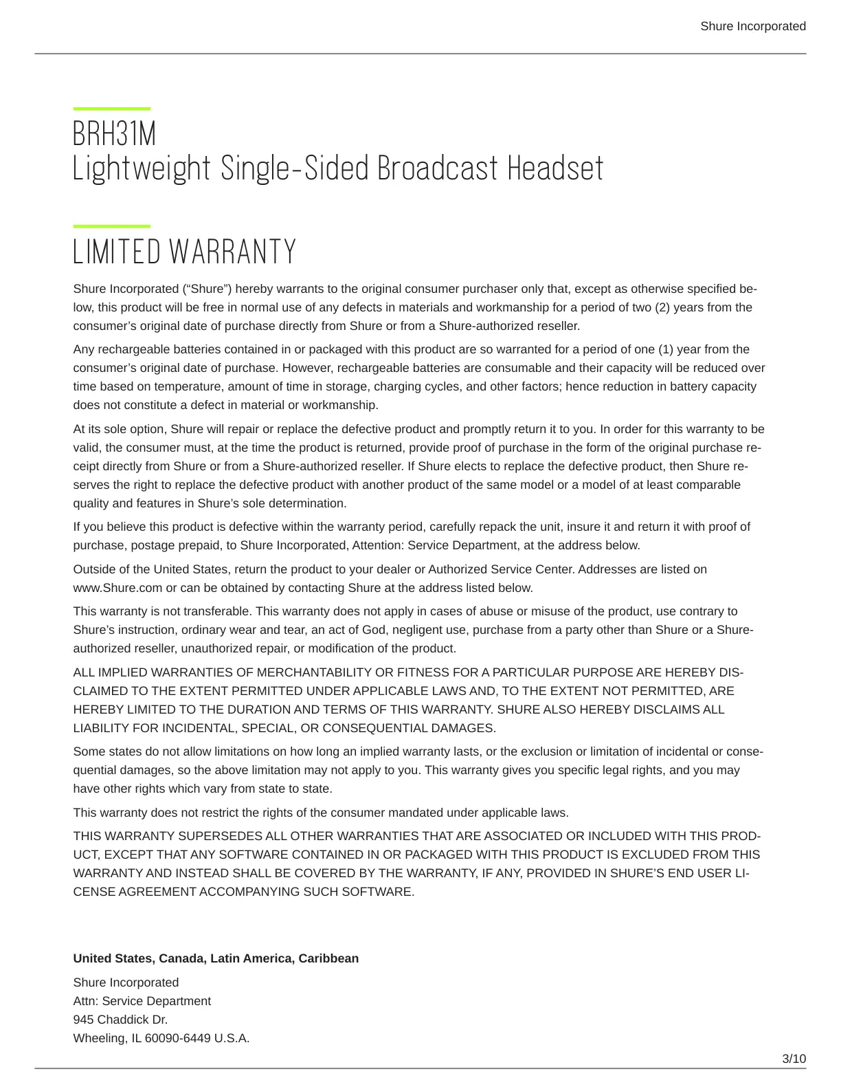 Shure Incorporated (“Shure”) hereby warrants to the original consumer purchaser only that, except as otherwise specified be