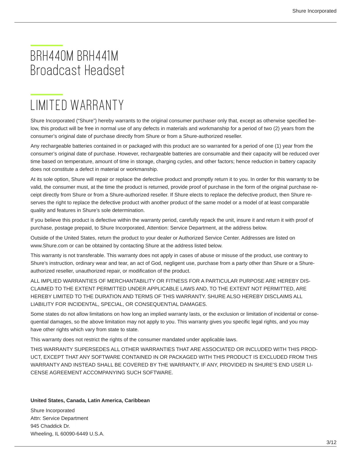 www.Shure.com or can be obtained by contacting Shure at the address listed below.