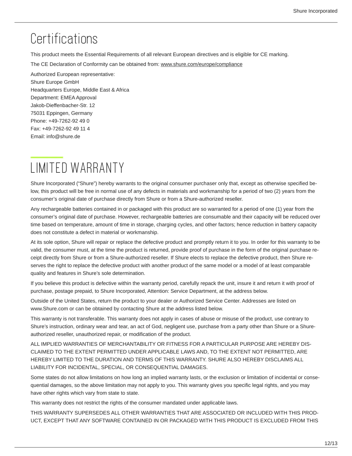 www.Shure.com or can be obtained by contacting Shure at the address listed below.