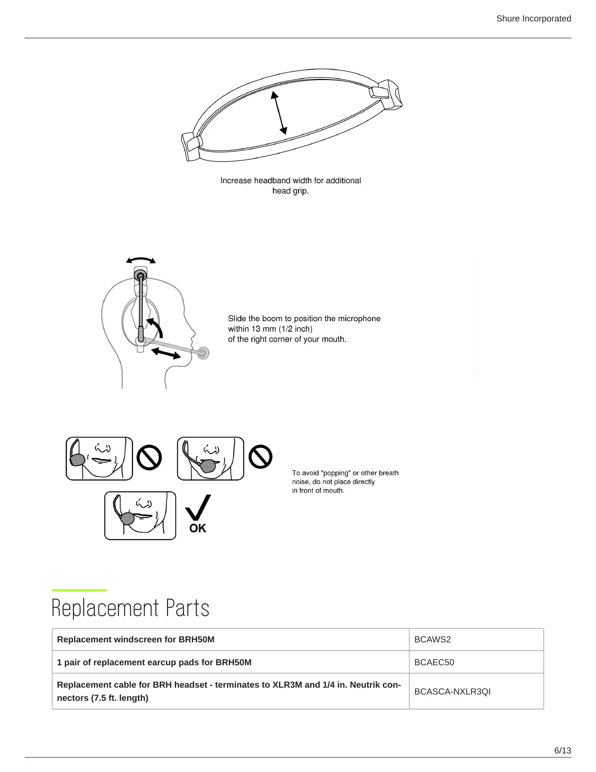 Replacement cable for BRH headset terminates to XLR3M and 1/4 in. Neutrik con
