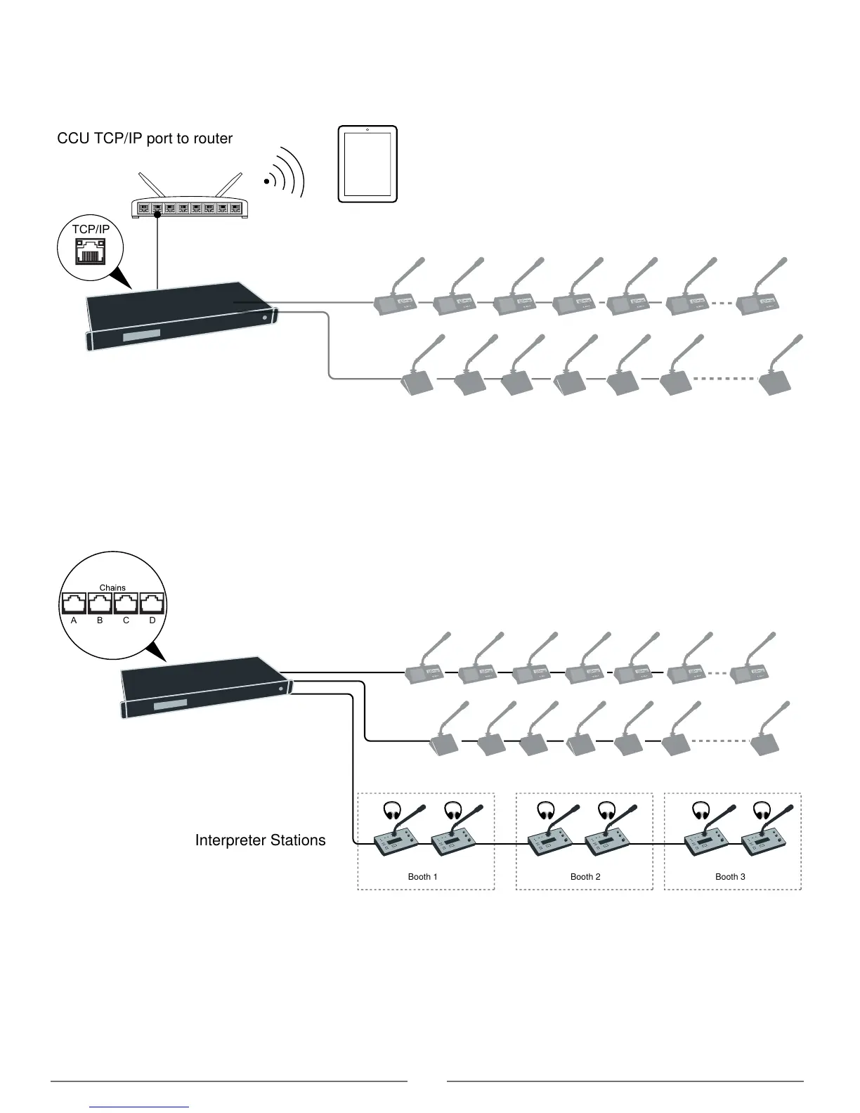 each microphone unit. Typically, a separate room or booth is dedicated for interpreters for greater sound isolation.