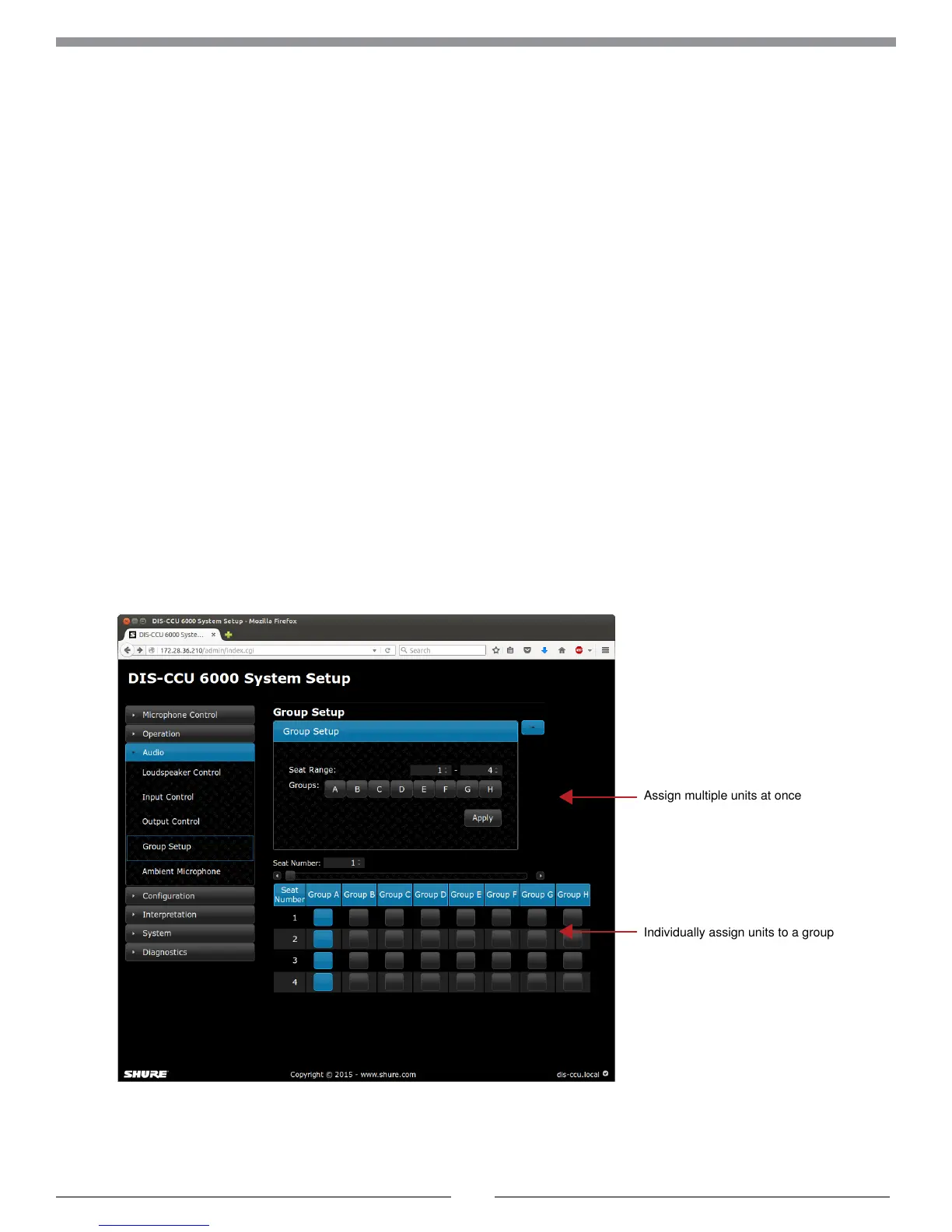 Go to the Group Setup page Audio > Group Setup to view or modify the microphone routing.