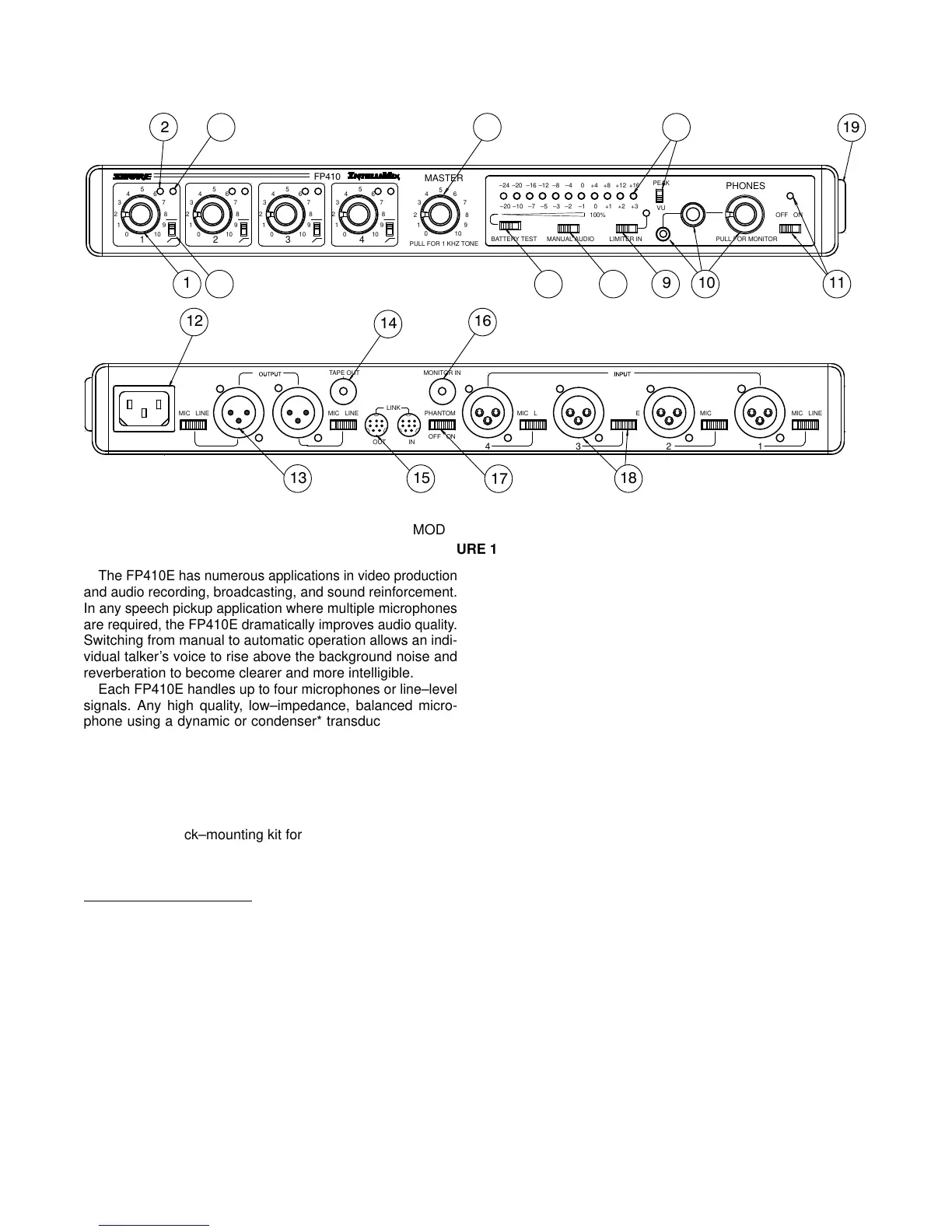 FP410E handles up to four microphones or line–level