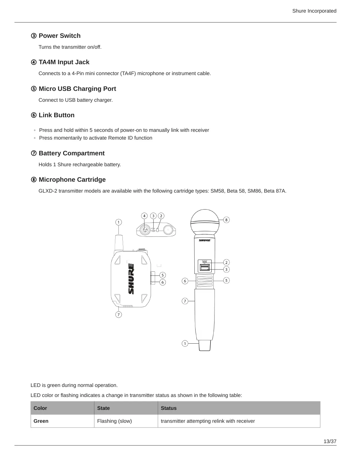 GLXD-2 transmitter models are available with the following cartridge types: SM58, Beta 58, SM86, Beta 87A.
