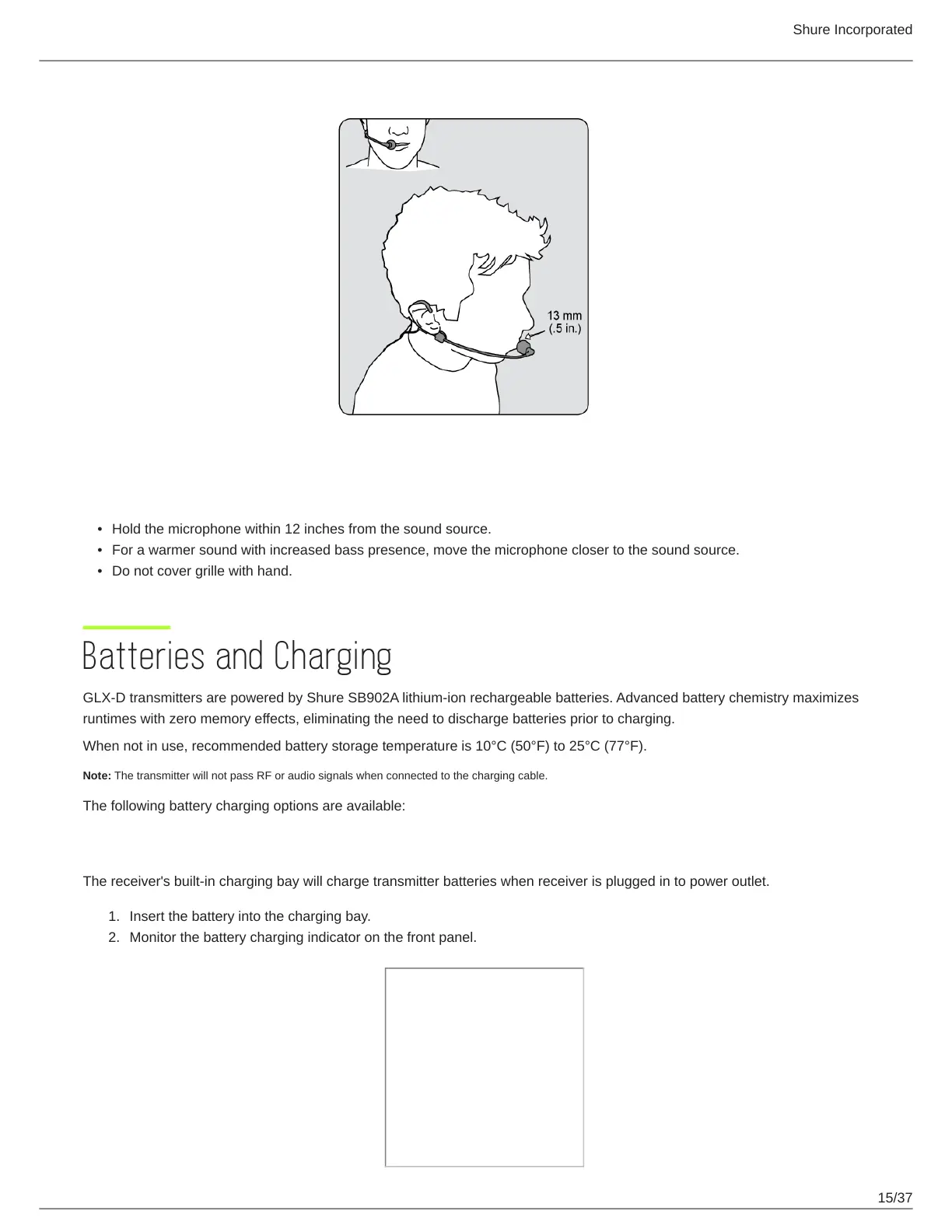 GLX-D transmitters are powered by Shure SB902A lithium-ion rechargeable batteries. Advanced battery chemistry maximizes