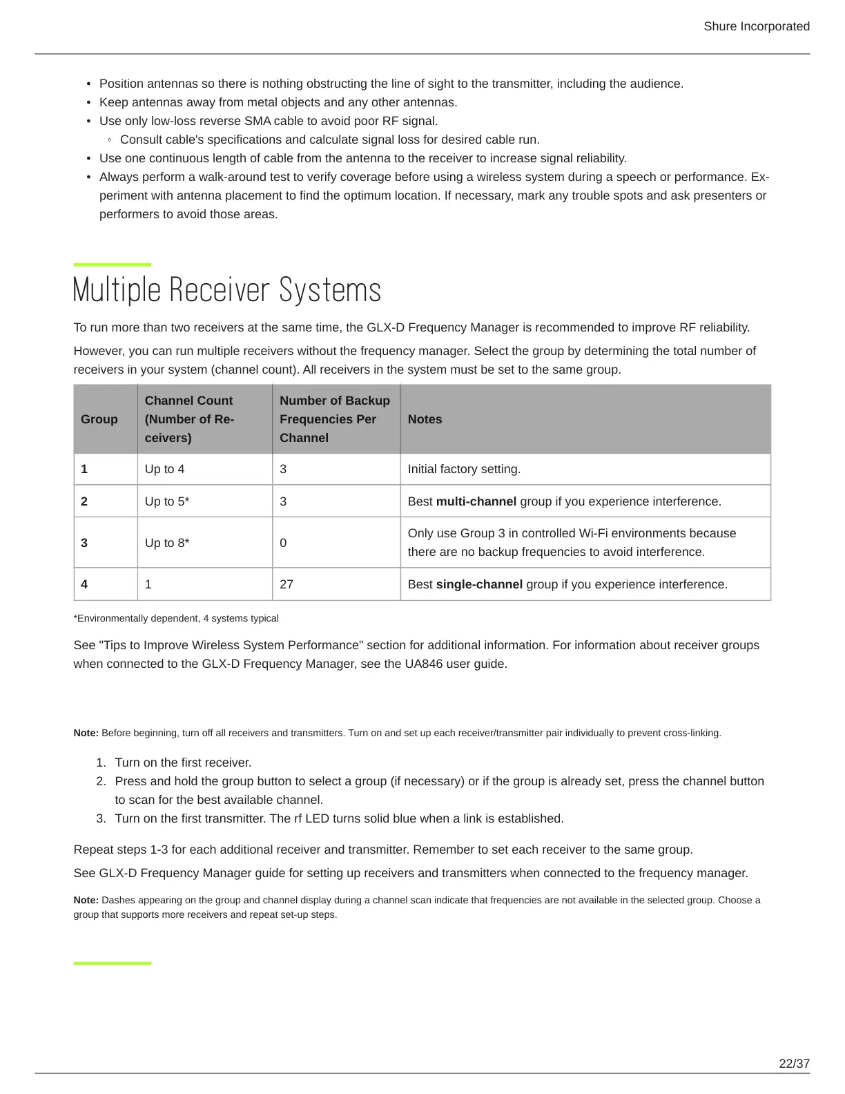 To run more than two receivers at the same time, the GLX-D Frequency Manager is recommended to improve RF reliability.