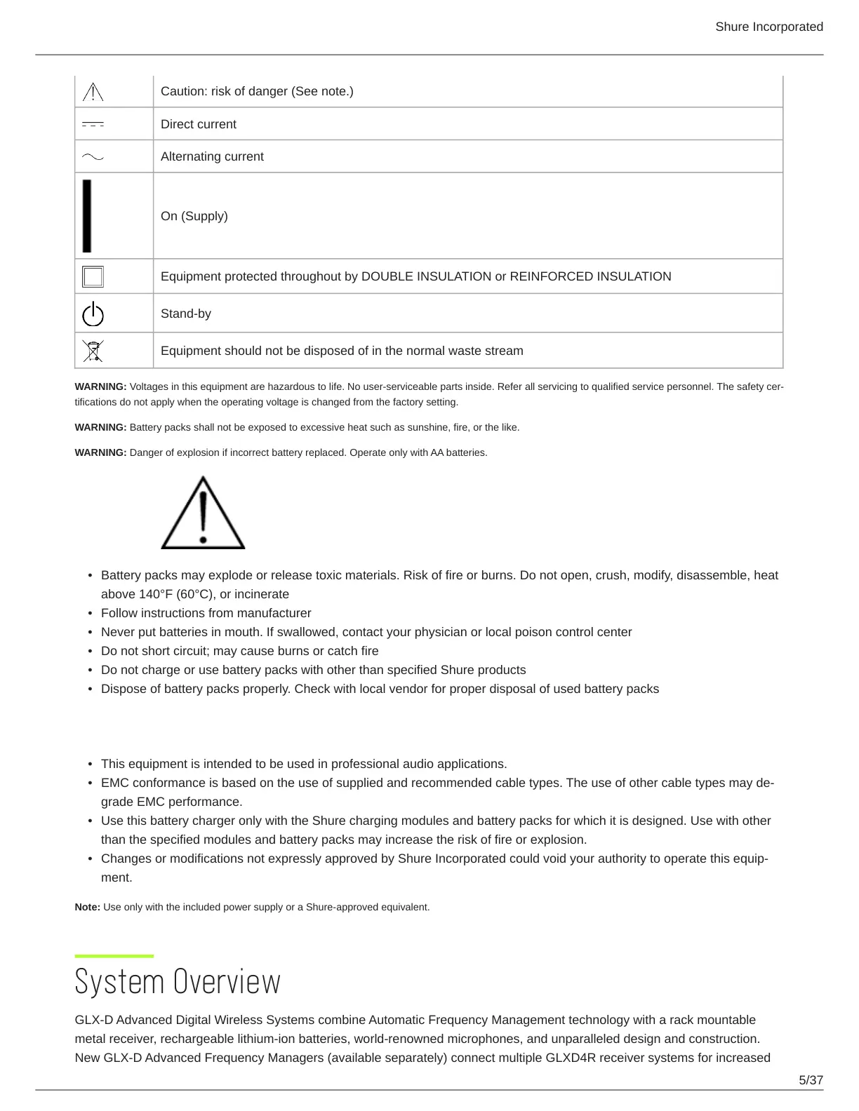 Do not charge or use battery packs with other than specified Shure products