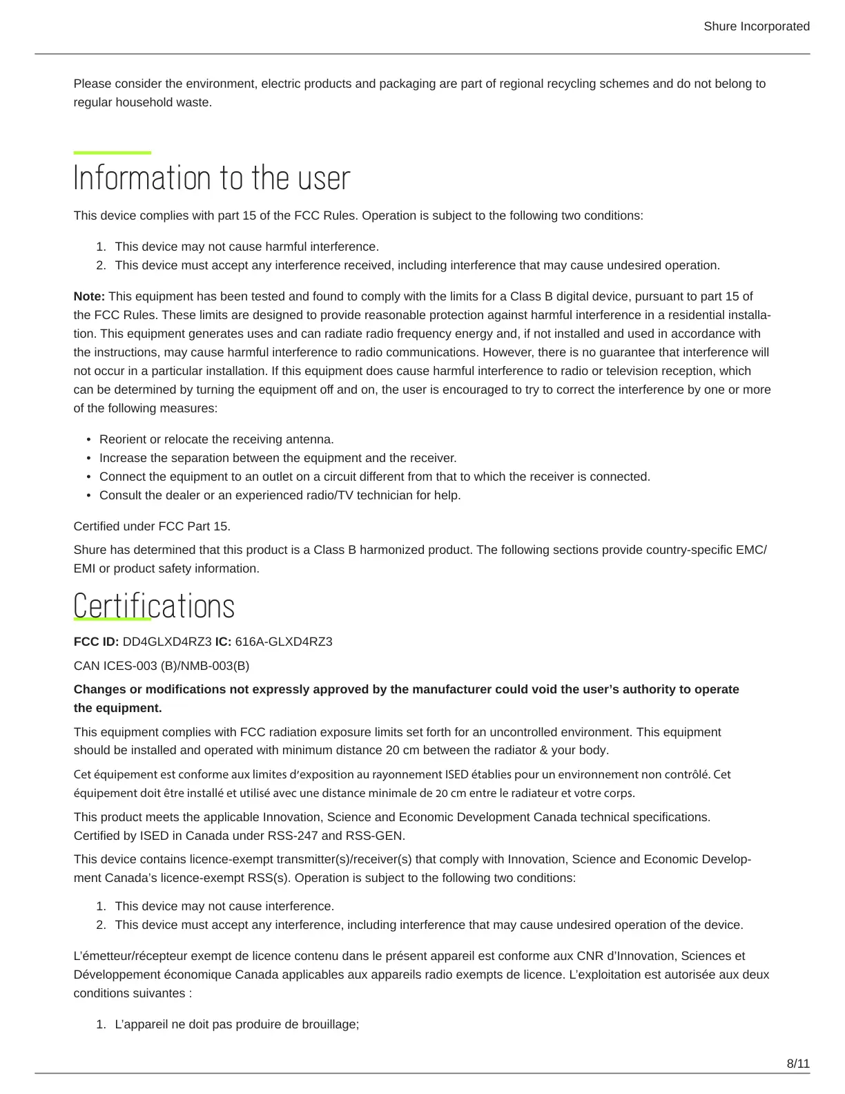 Shure has determined that this product is a Class B harmonized product. The following sections provide country-specific EMC/