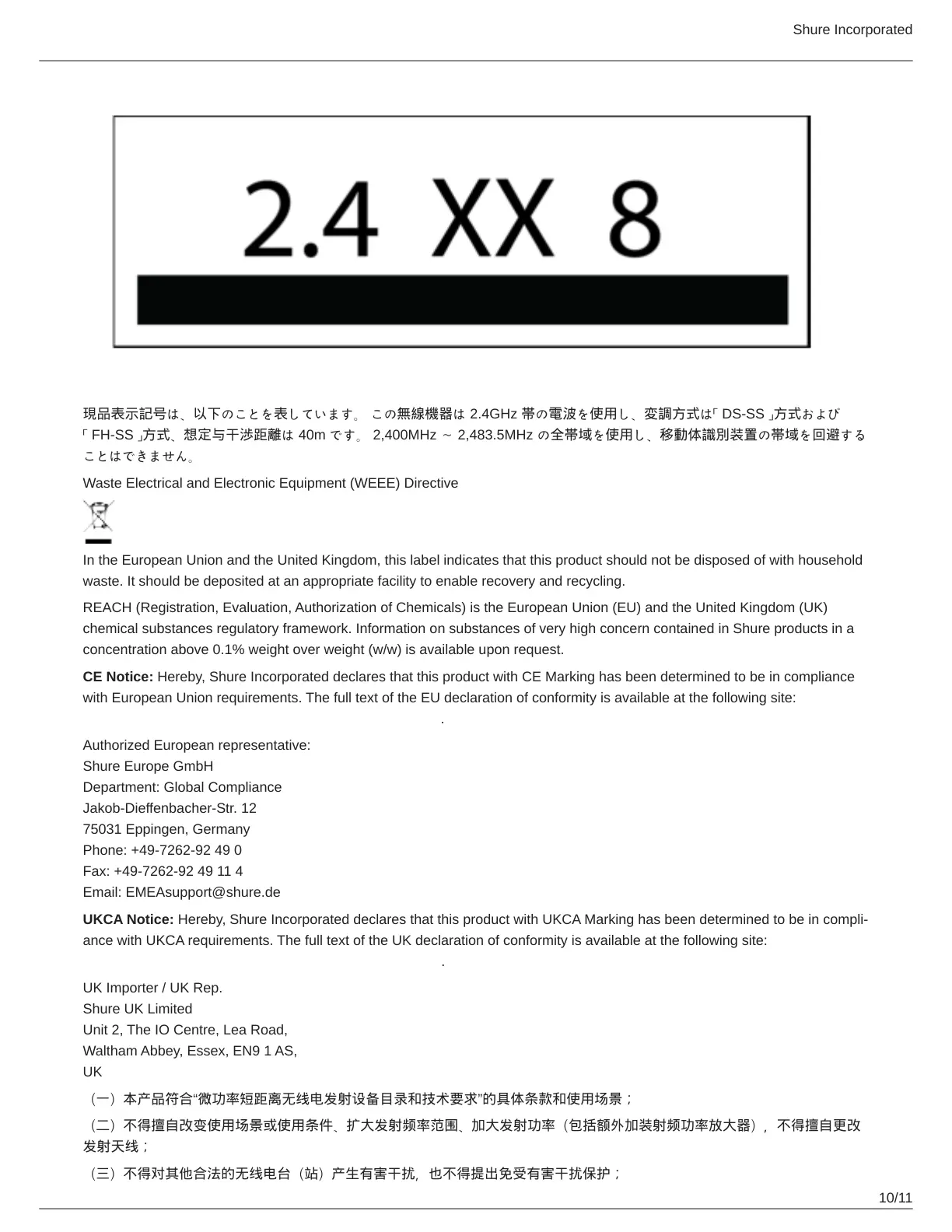 CE Notice: Hereby, Shure Incorporated declares that this product with CE Marking has been determined to be in compliance