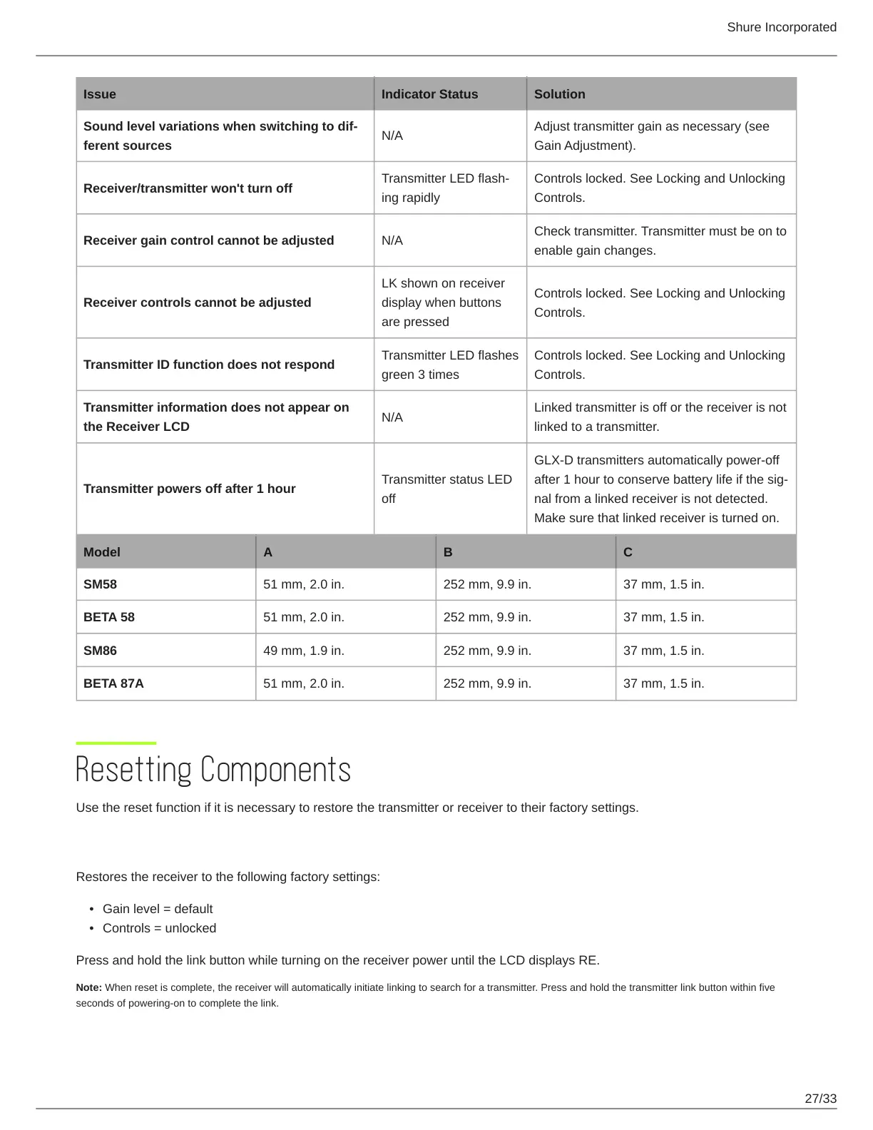 Use the reset function if it is necessary to restore the transmitter or receiver to their factory settings.