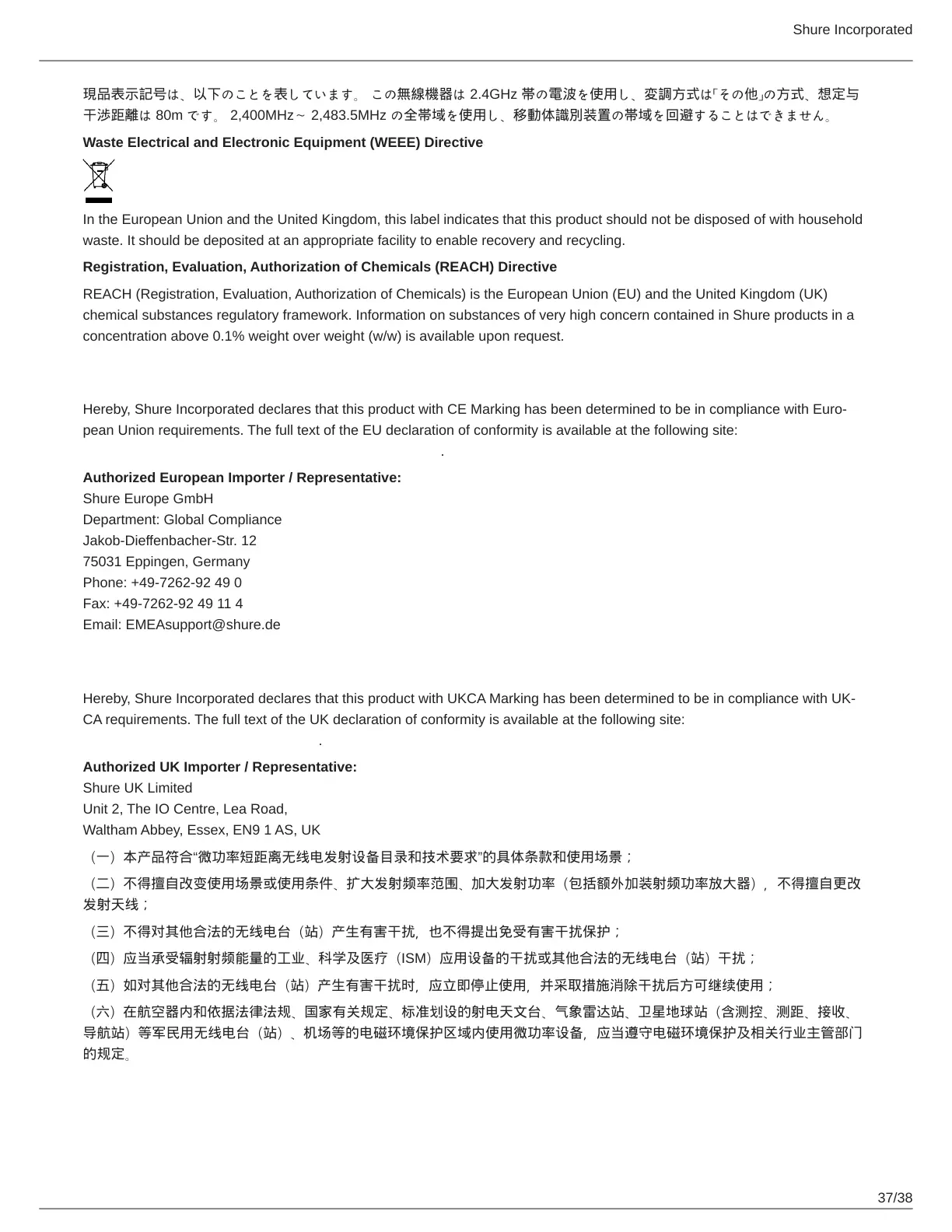 CA requirements. The full text of the UK declaration of conformity is available at the following site: https://www.shure.com/en-