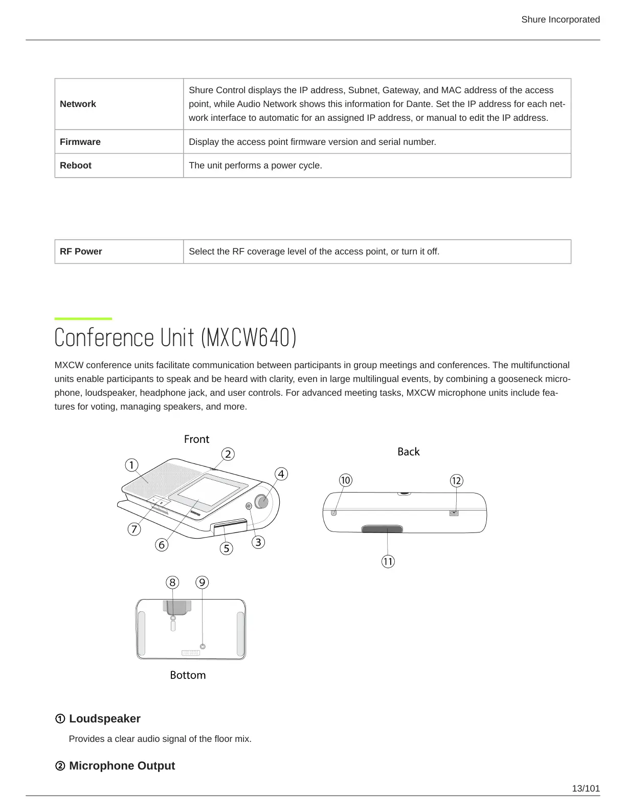 phone, loudspeaker, headphone jack, and user controls. For advanced meeting tasks, MXCW microphone units include fea