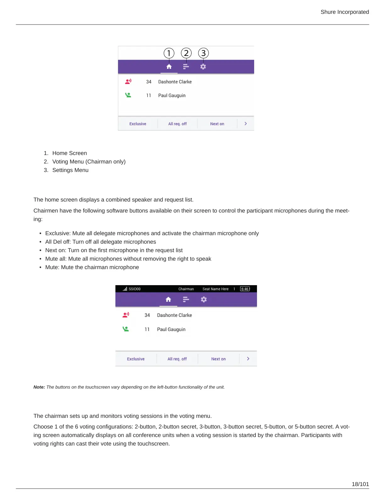ing screen automatically displays on all conference units when a voting session is started by the chairman. Participants with